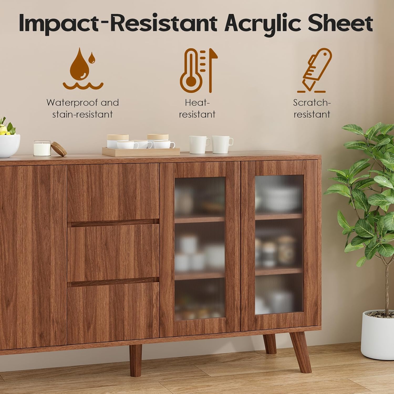 - Generous· Storage Capacity: This timeless American Farmhouse-style buffet cabinet features three spacious drawers, designed to enhance both functionality and storage versatility. The drawers provide ample room to neatly organize and store a variety of items, from dinnerware to household accessories, while maintaining privacy. With easy access and efficient organization, these drawers help keep your home tidy, stylish, and effortlessly functional.