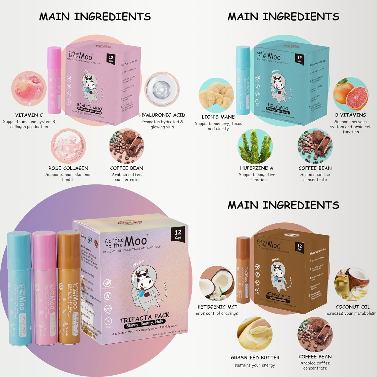 - 📦 The Complete Cold Coffee Concentrate Pack - Trifacta Pack offers 4x Skinny Moo, 4x Beauty Moo, and 4x Holy Moo (Mushroom Coffee) blends, catering to various lifestyles and wellness goals like boosting brain functions, or improving your hair, skin, and nails. Complete Cold Brew Kit.