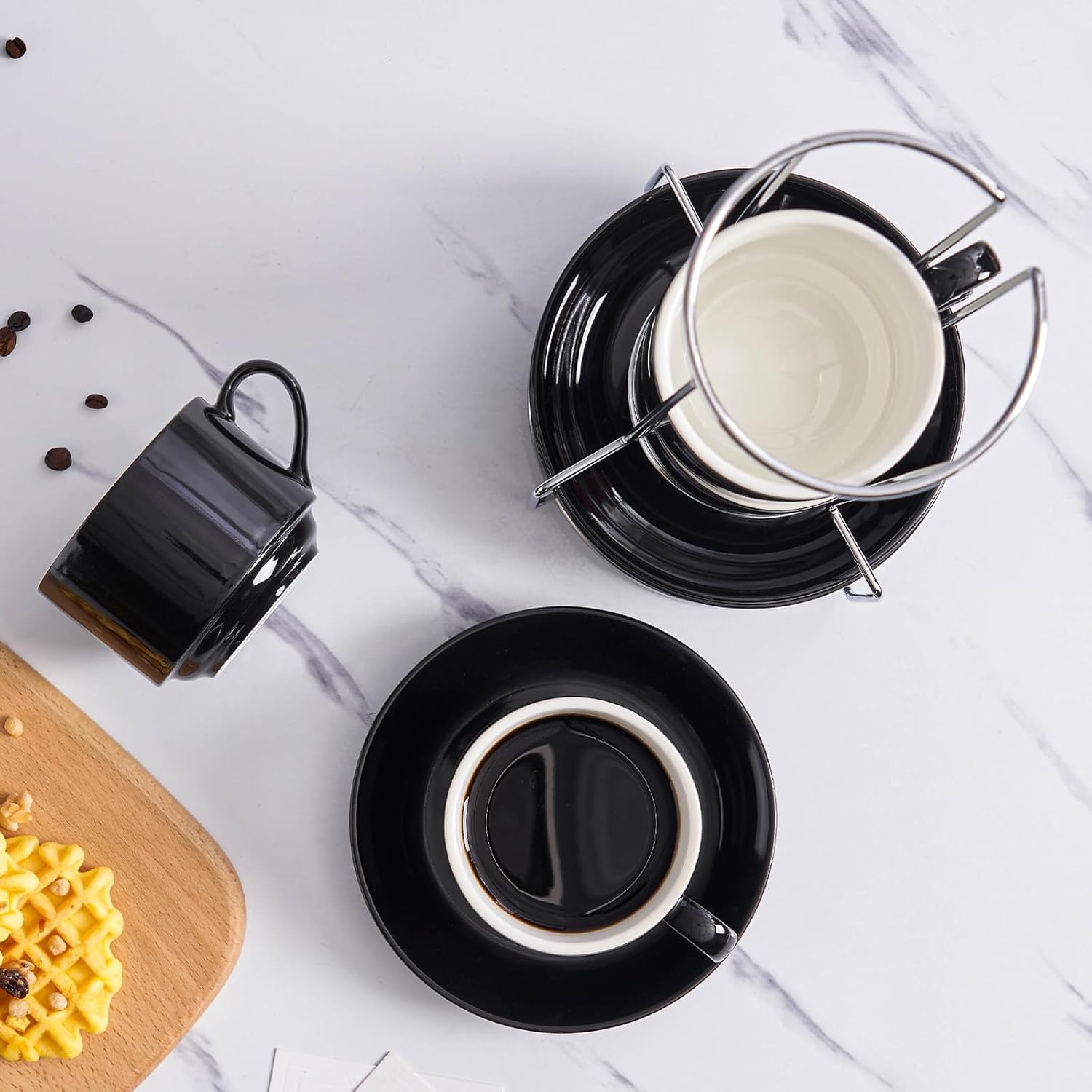 - The cups and saucers can be stacked neatly on the metal stand for easy organization, keeping your coffee corner clean and tidy. Say goodbye to clutter and embrace the simplicity of an organized life.
