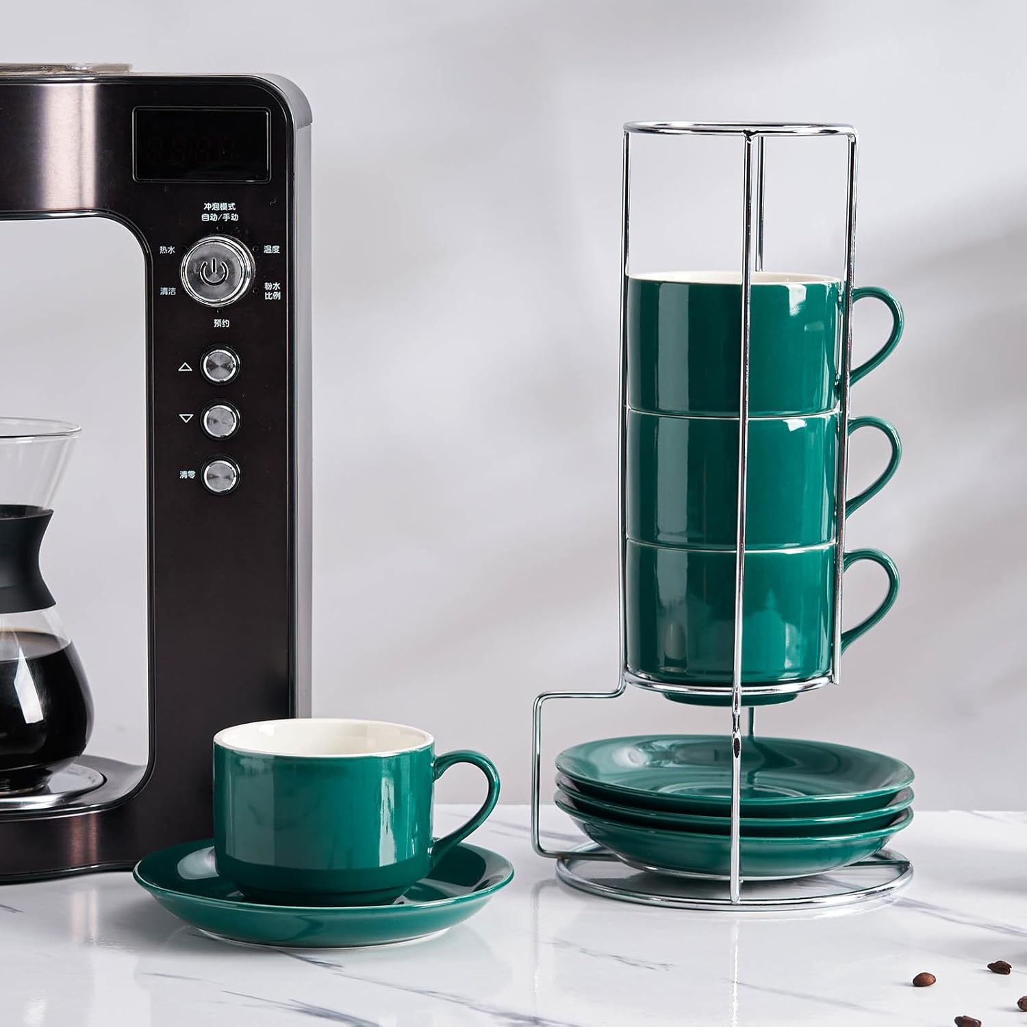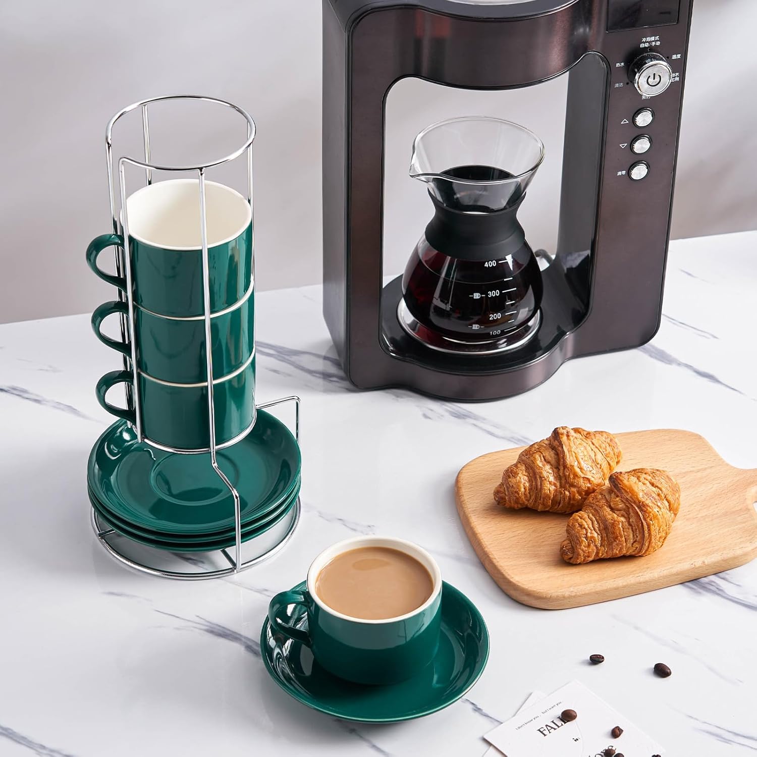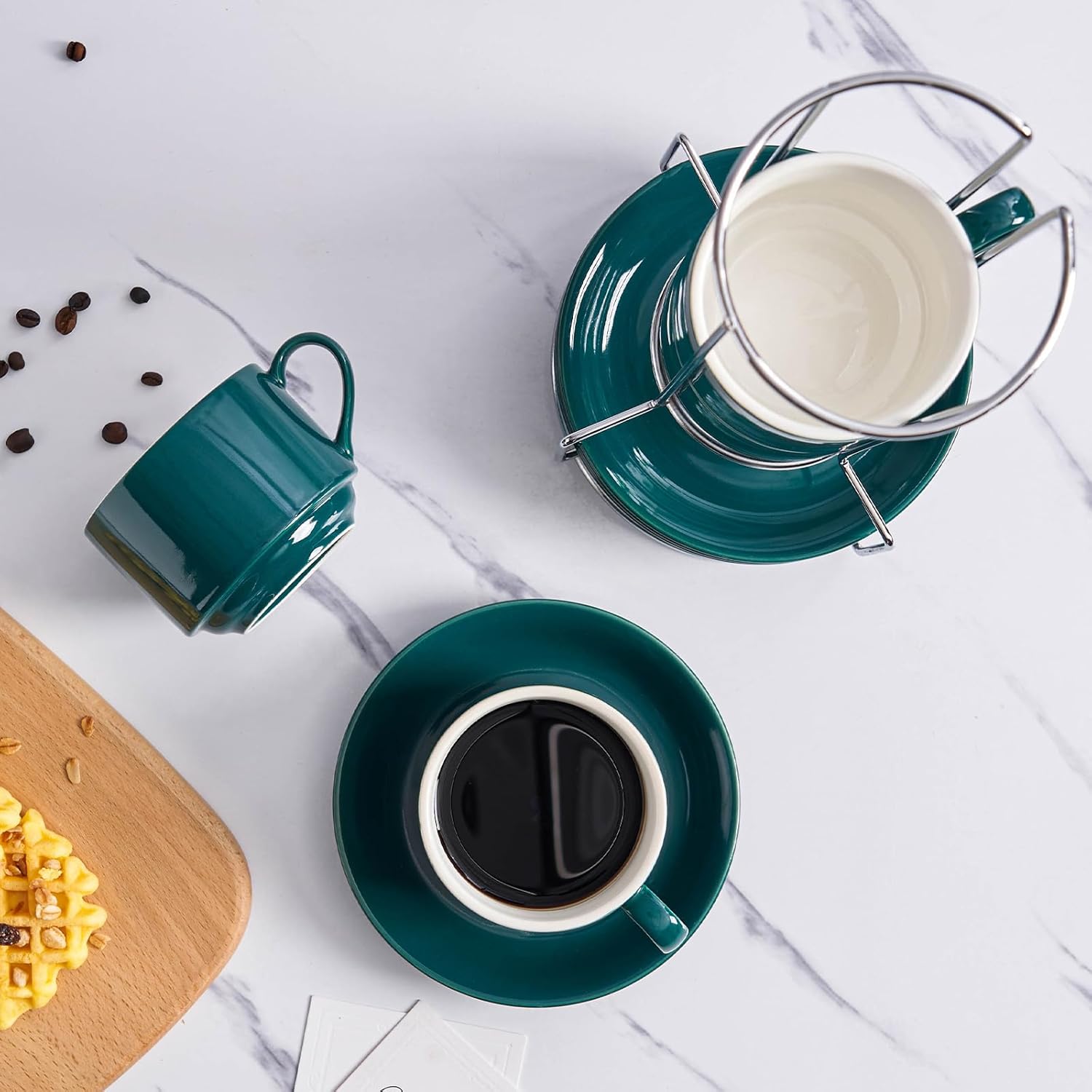 8 Ounce Porcelain Cappuccino Cups with Saucers and Silver Stand, Green Cups Set of 4