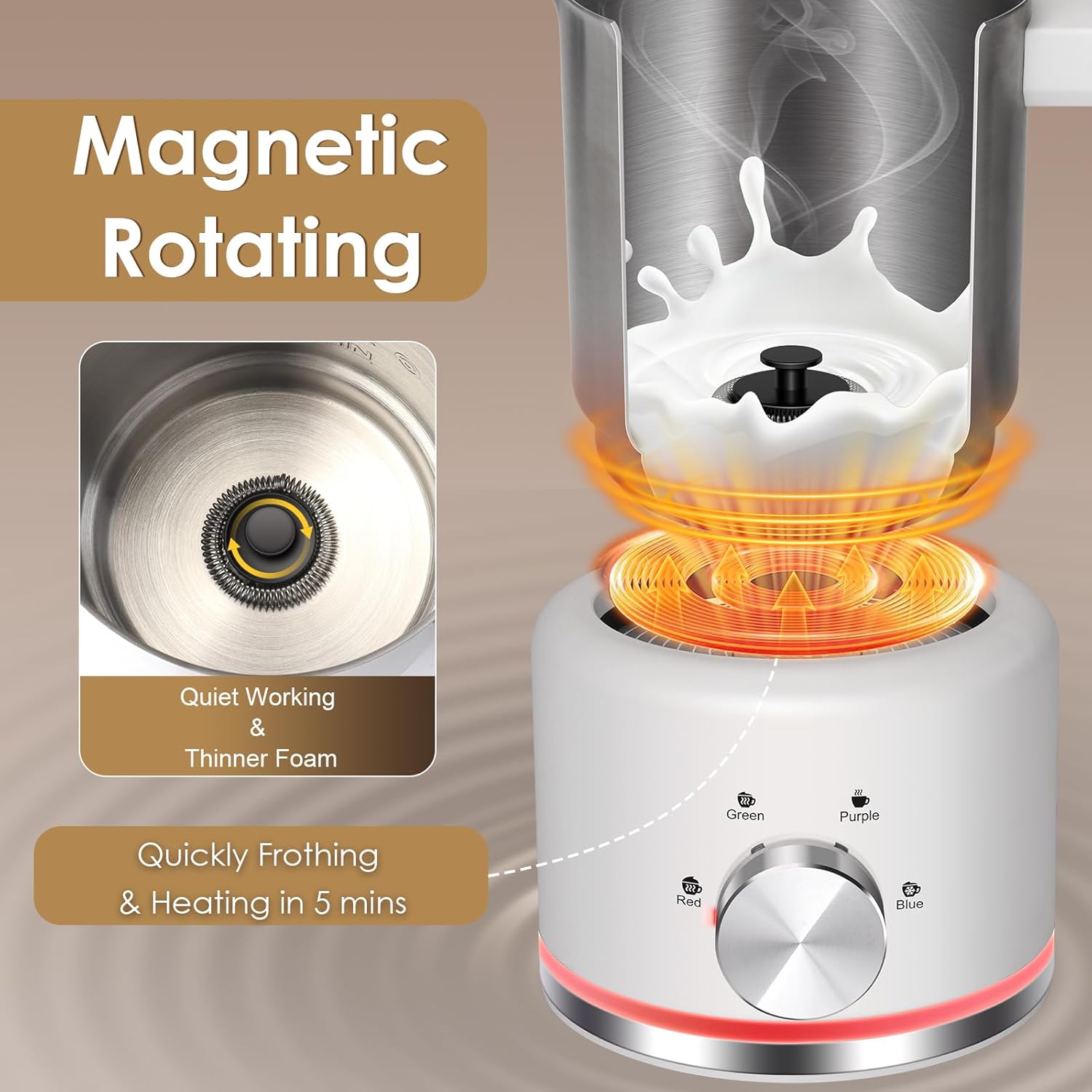 - 𝐌𝐚𝐠𝐧𝐞𝐭𝐢𝐜 𝐑𝐨𝐭𝐚𝐭𝐢𝐧𝐠 𝐓𝐞𝐜𝐡𝐧𝐨𝐥𝐨𝐠𝐲-The rotating whisk inside the milk frother electric's container to spin and agitate the milk, introducing air and creating foam, that makes stable and consistent frothing what brings consistent agitation, the milk foamer for coffee ensures the foam tinier than other traditional milk frother. Compared to other milk frother, the magnetic rotation technology minimizes the friction between the whisk and the container, improving durability, and making the frother run more quietly.