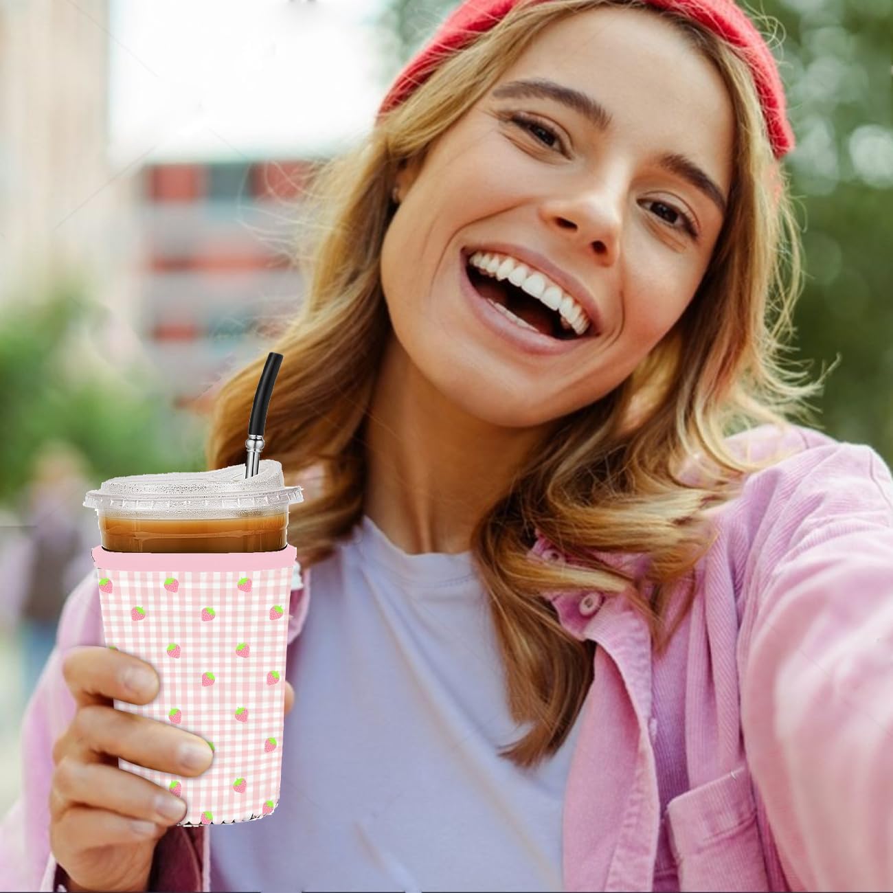 Reusable 3-Pack Iced Coffee Cup Sleeve, Insulated Neoprene, Beverage Holder for Iced Coffee, Durable Drink Sleeve for Cold Beverages, Strawberry Grid