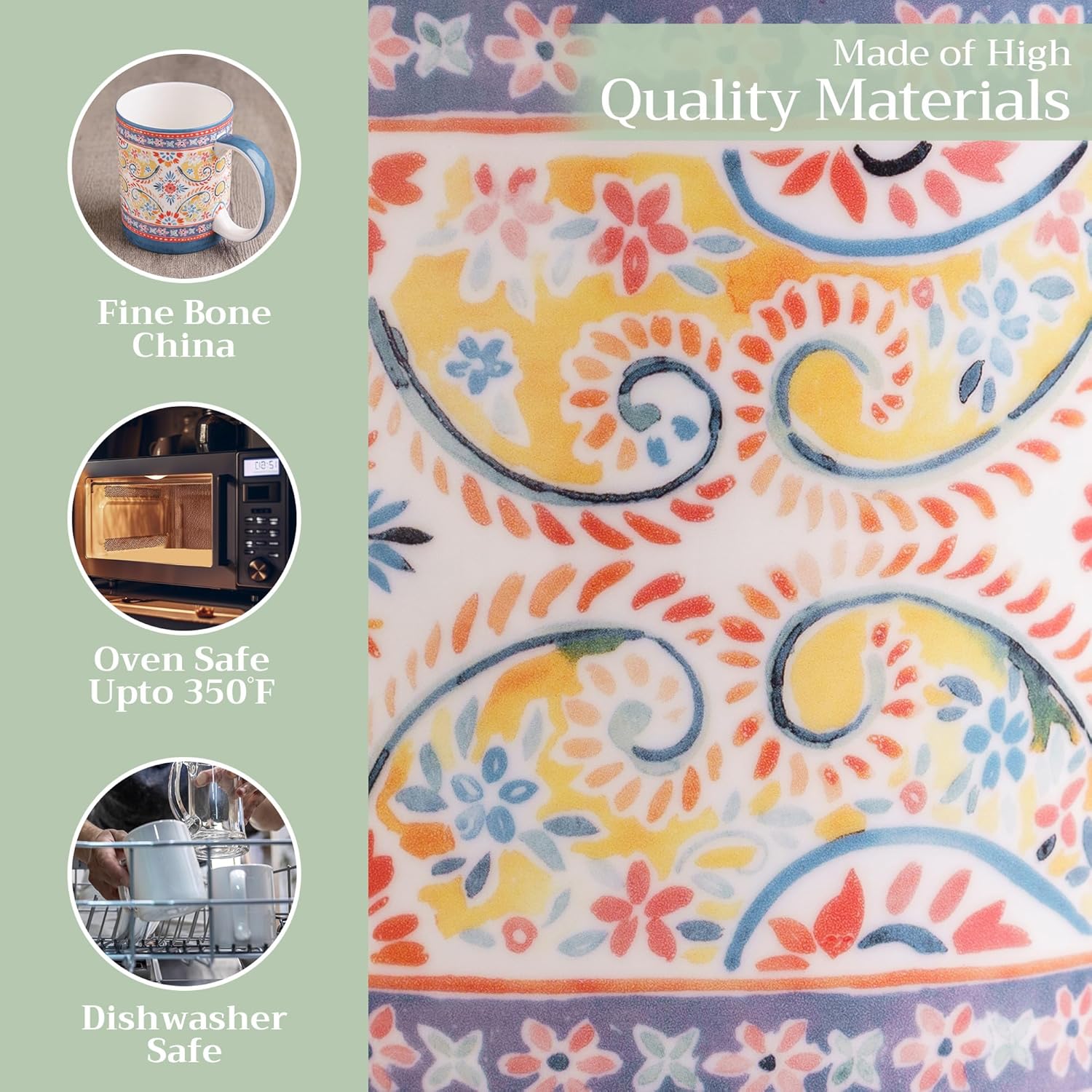 - EASY CARE & MAINTENANCE: Safe enough for Dishwasher Microwave Freezer. It is made of fine bone China and is oven safe to 350° F.