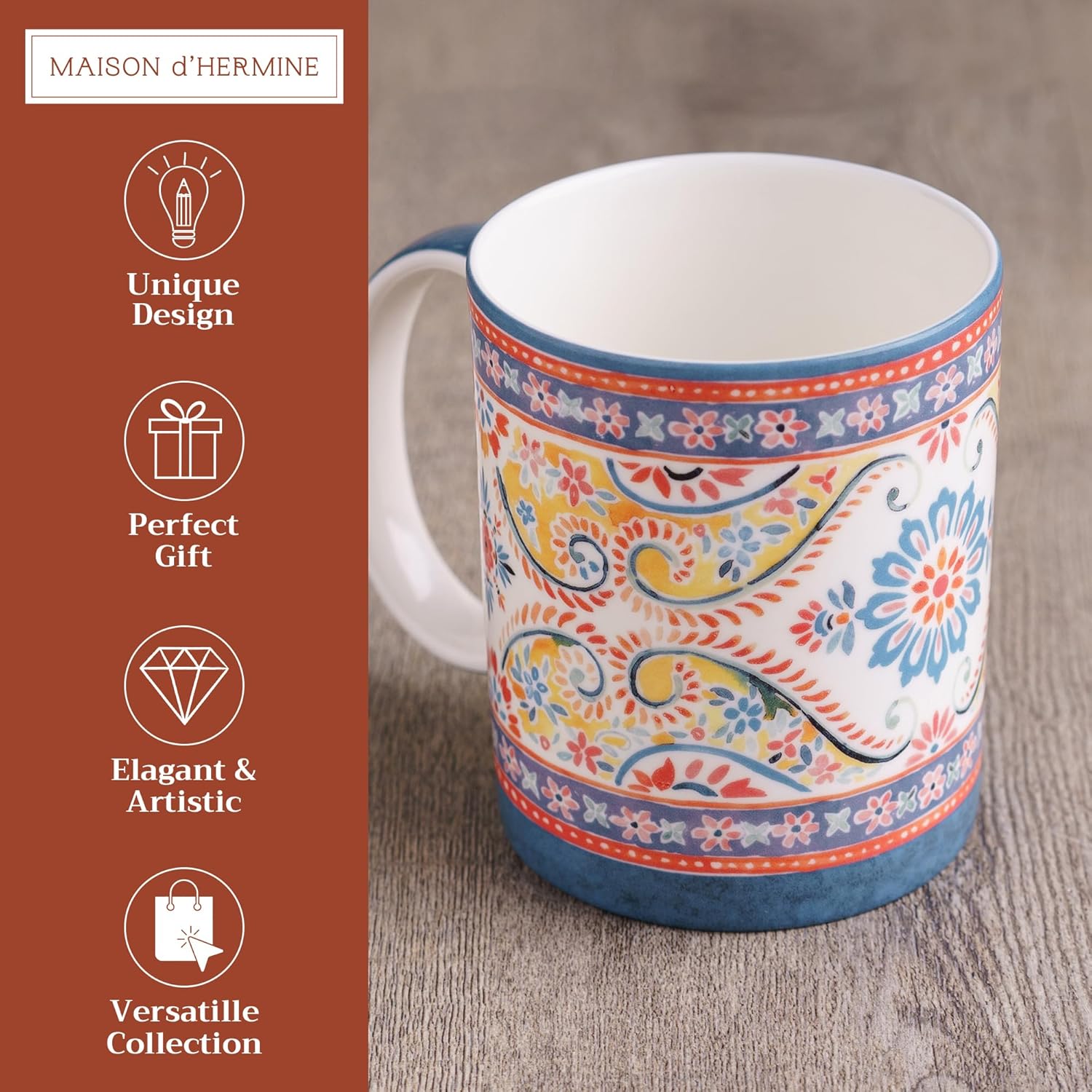 Maison d' Hermine Coffee Mug with Handles Fine Bone China Mugs Pack of One Tea Cups for Hot Beverages Cappuccino Latte Home Restaurant Office Perfect for Gift (Indian Floral - Butta, 12 Ounce)