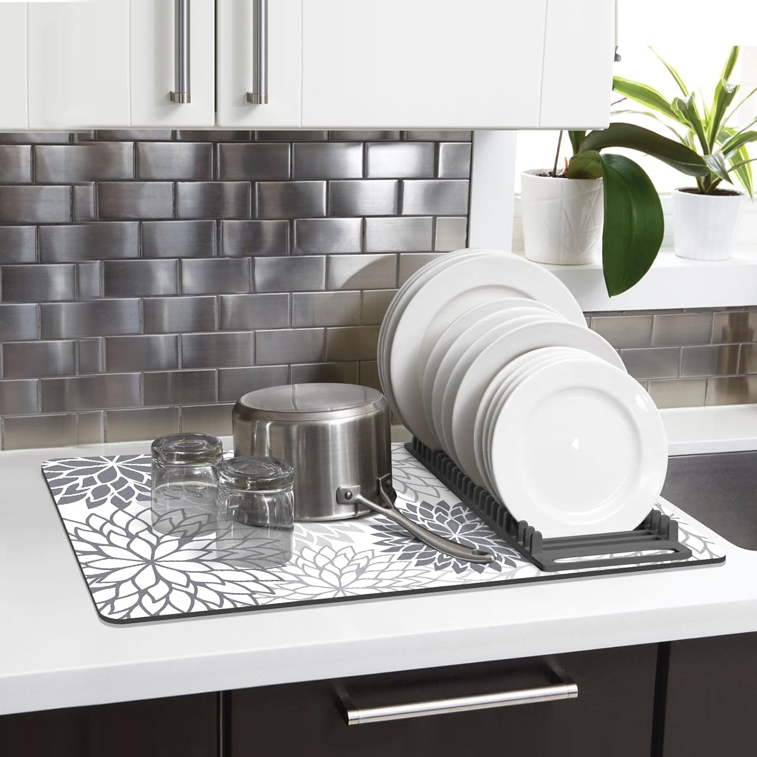 Findosom 2PCS 12" x 20" Dish Drying Mat & 24" x 5.5" Sink Splash Guard, Super Absorbent & Cuttable Dish Mat Drying Kitchen Mat with Gray Floral, Hide Stain Drying Mat for Kitchen Counter
