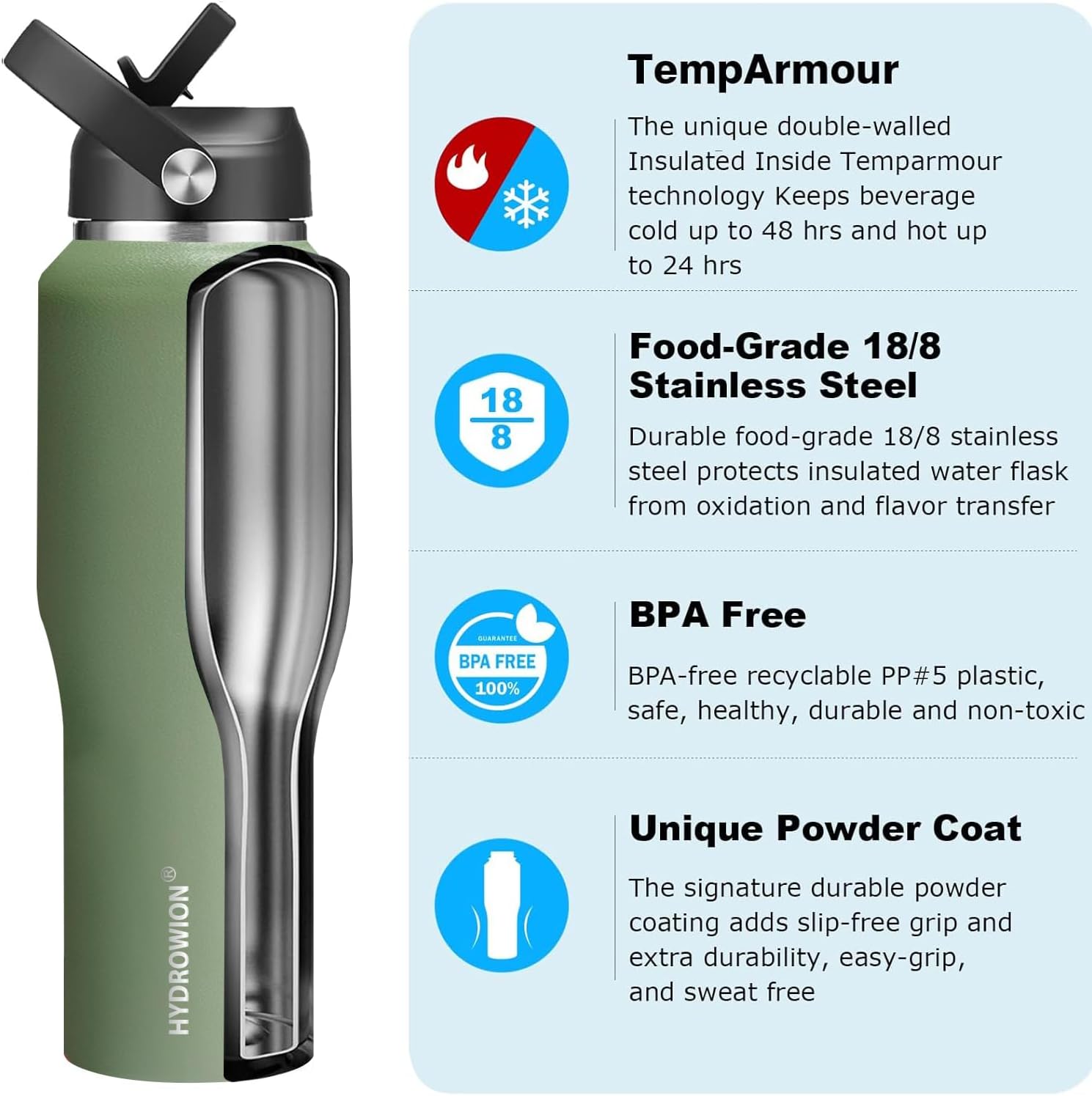 HYDROWION Water Bottle Stainless Steel,Vacuum Insulated Leak Proof Tumbler 32oz with Straw Lid, Spout Lid and Flex Cap(Cold for 48 Hrs, Hot for 24 Hrs), Fit in Any Car Cup Holder, Moss