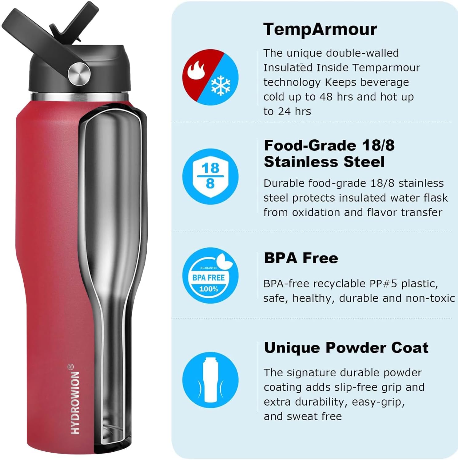 - 【VACUUM INSULATED】 Unique technology inside HYDROWION 32oz water bottle keeps cold drink icy for up to 48 hours and hot beverage steaming up to 24 hours, make sure your every sip is the feeling you want. Excellent leak proof sealing lid prevents leakage so that you can just grab and go
