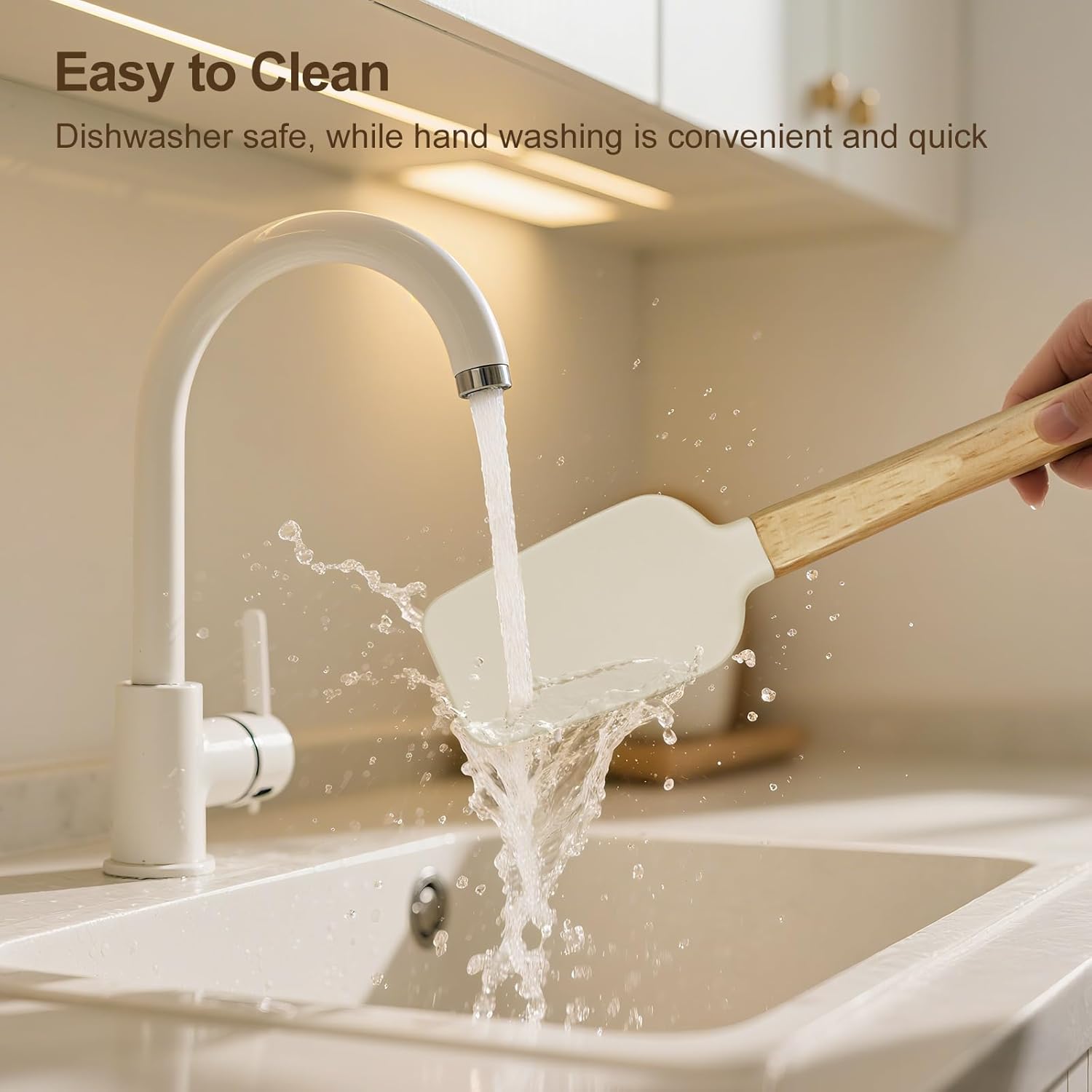 - 【Stylish & Functional Kitchen Essential】 Sleek off-white silicone head and natural wood handle combine modern elegance with practicality, 4 different sizes of spatulas to meet all your needs.