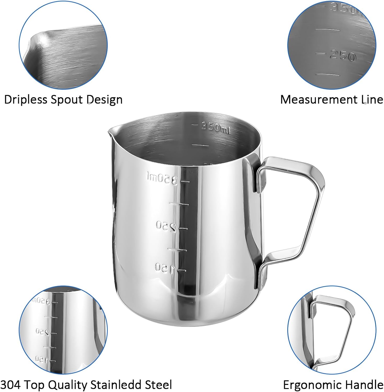 - Commercial-Grade Construction: Made with food-safe 304 stainless steel, these milk frother pitchers resist rusting and discoloration. The rounded spout ensures drip-free pouring for perfect latte art, while the ergonomic handle provides heat resistance and secure grip during milk steaming.