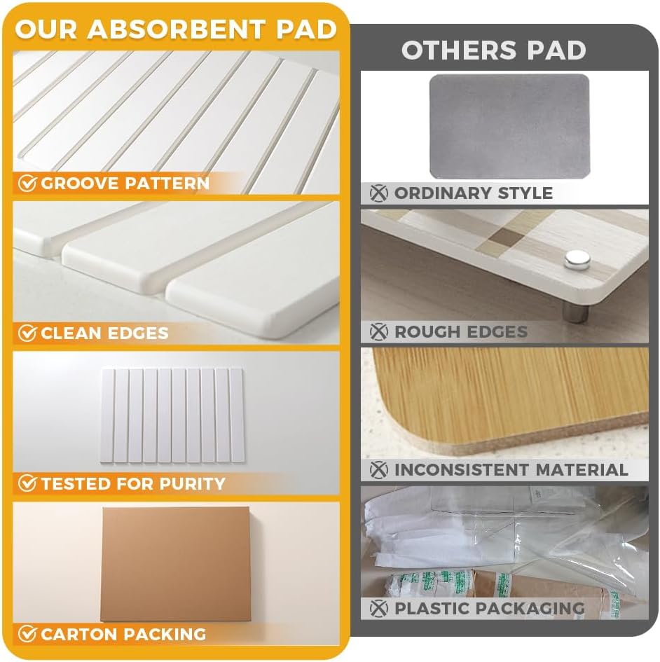 - 【EFFICIENT WATER ABSORPTION】The unique porous structure of the diatomaceous earth material enables the dish drying mat to rapidly absorb the water on the surface of tableware. Its water absorption speed is several times faster than that of ordinary draining pads, which largely shortens the draining time