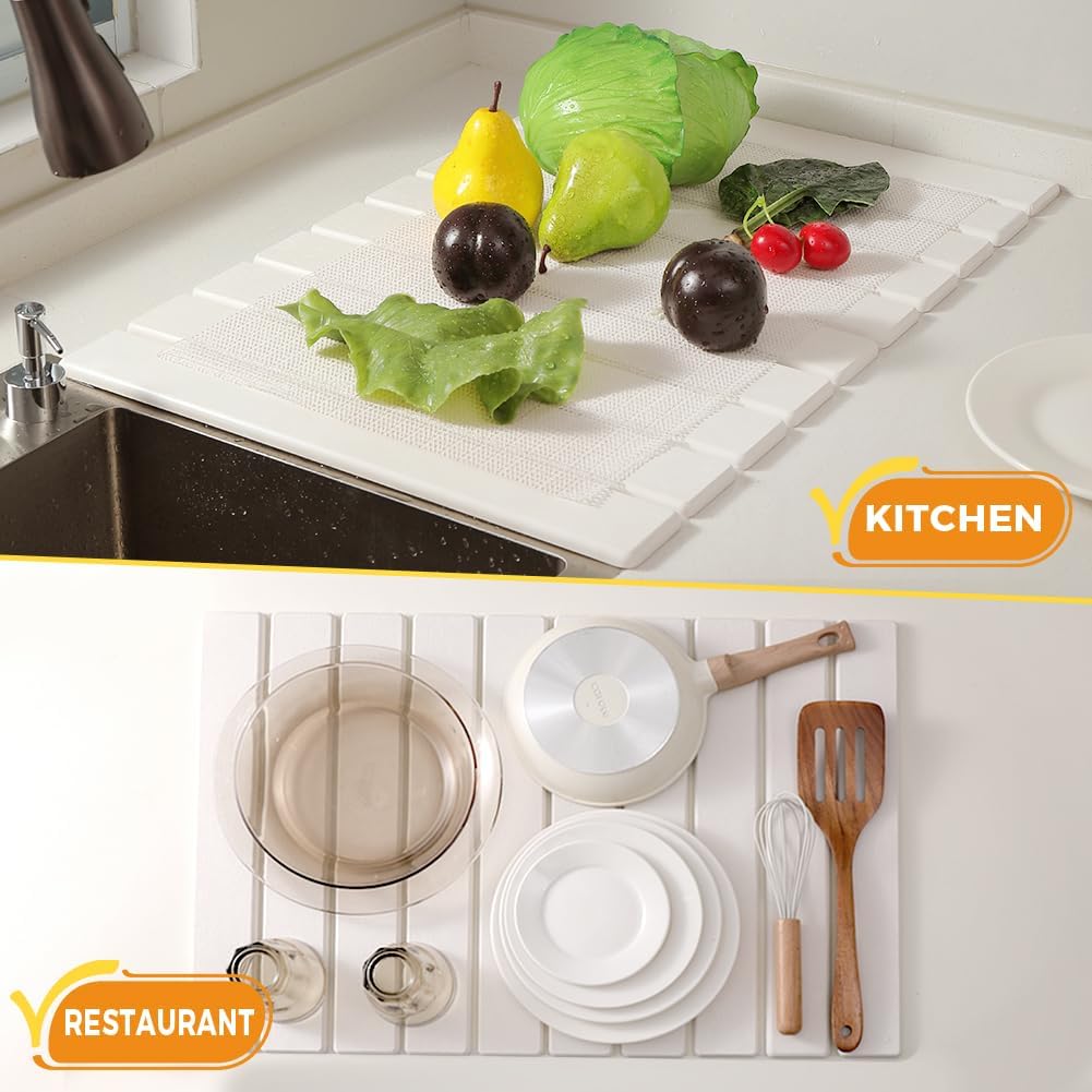 - 【LARGE-SIZE DESIGN】The kitchen drying mat is larger in size than standard ones, which can hold multiple sets of tableware simultaneously. It meets the daily needs of families and eliminates the need for repeated re-arranging or draining tableware in batches