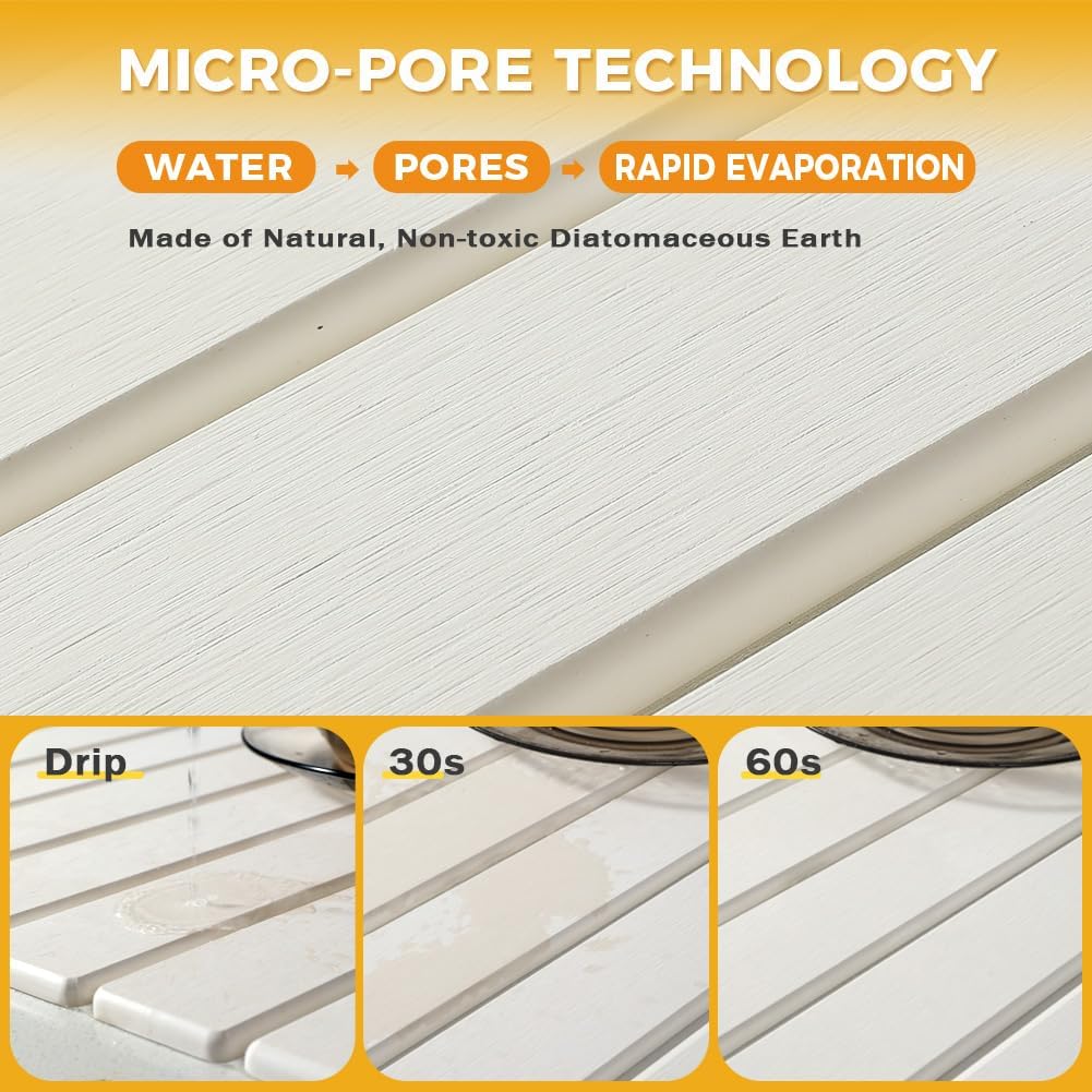 - 【FOOD-GRADE MATERIAL】Diatomite is a natural and eco-friendly material that can directly come into contact with tableware, ensuring safety in use. Once water is absorbed, it will evaporate rapidly, keeping the dish drainer mat and the kitchen countertop dry and clean at all times. For daily cleaning, just rinse it with water