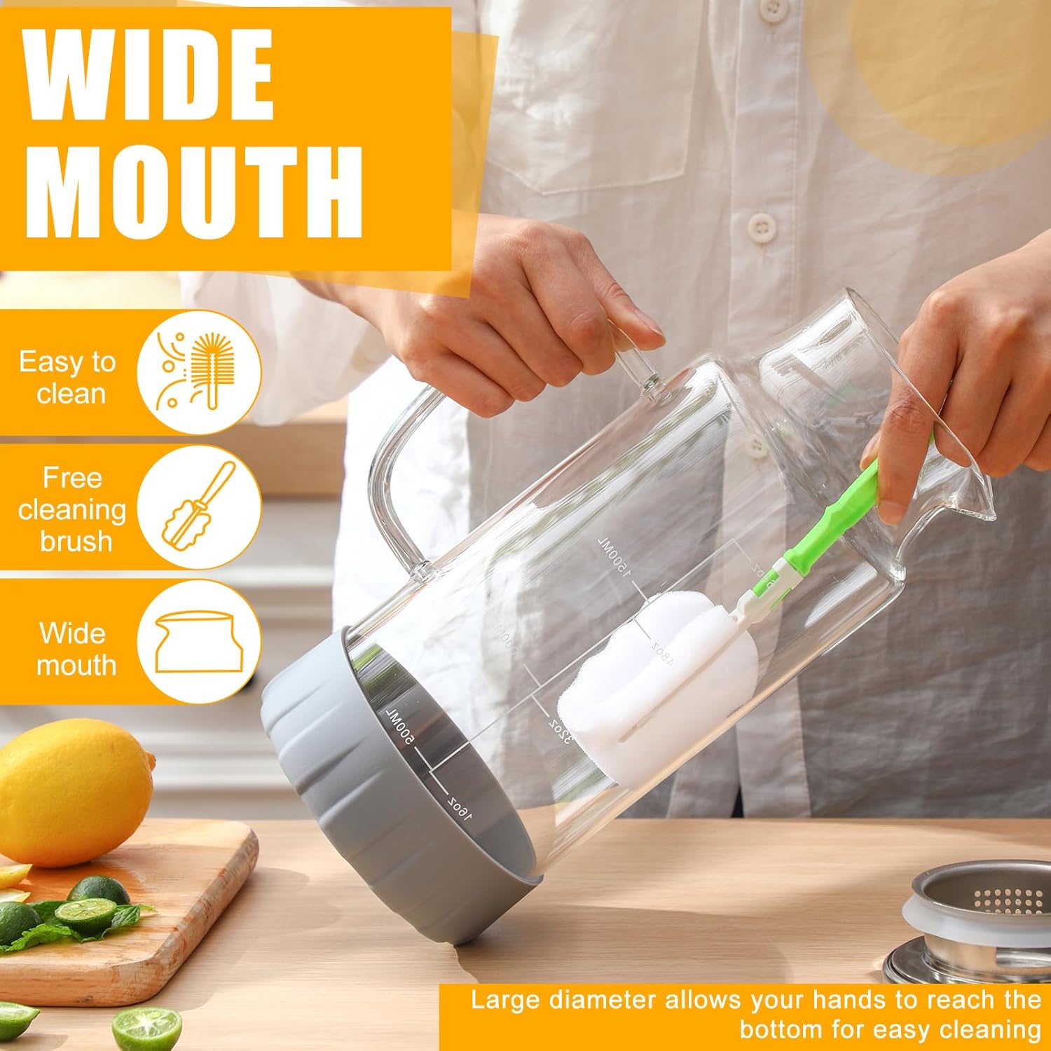 - Large Capacity and Accessory Set: you will receive 2 glass pitchers with a capacity of 2 L/68 oz, equipped with stainless steel lids, 2 long handle brushes; The water pitchers feature a thoughtfully designed spout and a thick, ergonomic handle, with two pouring modes and a built-in filter, making them ideal for large gatherings or keeping your family hydrated throughout the day; They are a ideal choice for professional use in restaurants, cafes, and tea houses