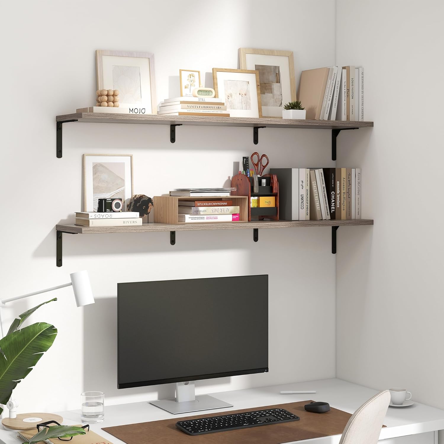 - 【Strong & Durable Construction for Long-Lasting Use】Each shelf is made from premium high-density MDF with a smooth, durable surface resistant to warping and cracking. Paired with heavy-duty black L-shaped steel brackets, these shelves provide excellent strength and stability. Properly installed, each shelf supports up to 50 lbs, perfect for books, kitchen items, and decor. Built to endure daily use in kitchens, living rooms, offices, or bathrooms, combining durability with timeless style.
