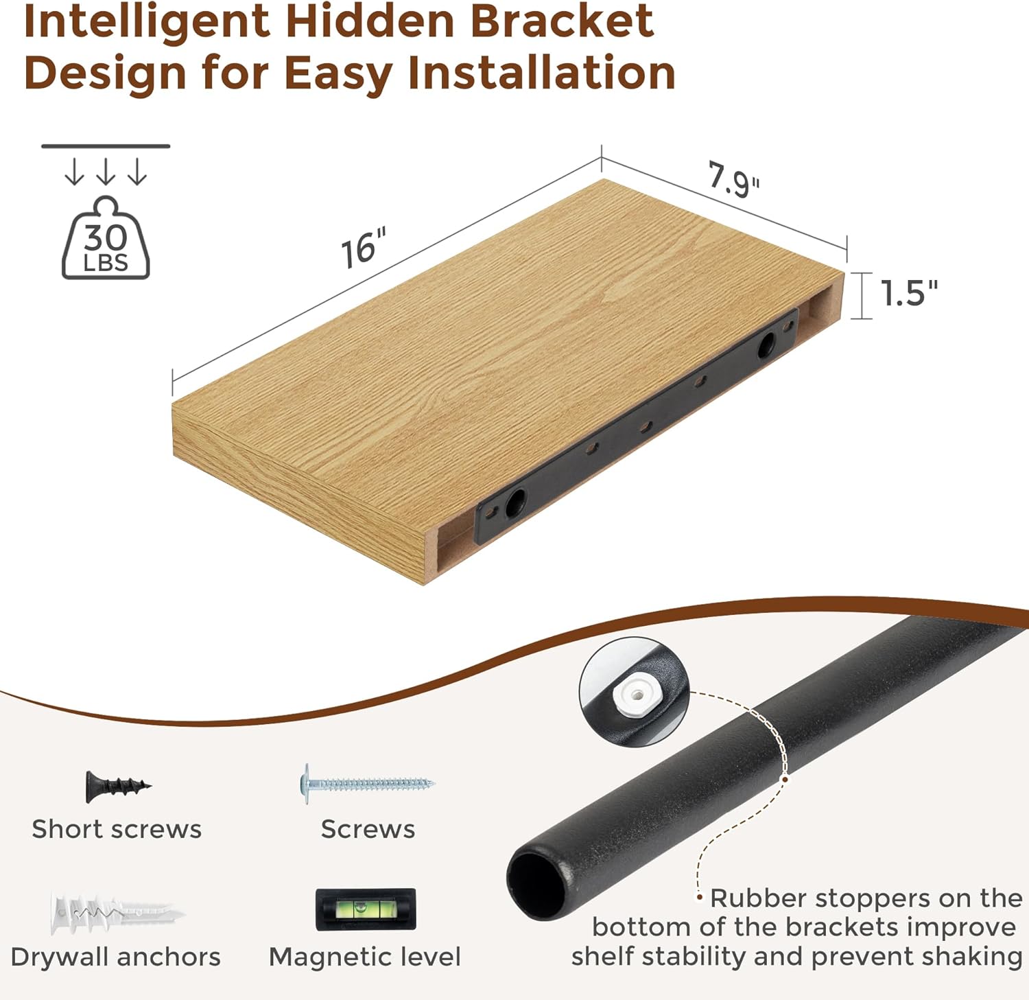 - 【Sturdy Support】Make the most of your wall space with our 16 x 8 inch oak floating shelves for wall for room wall. At 1.5 inches thick, they offer sturdy support for your plants and decorative pieces. Each shelf can hold up to 30 lbs, ensuring your items never sag or fall.