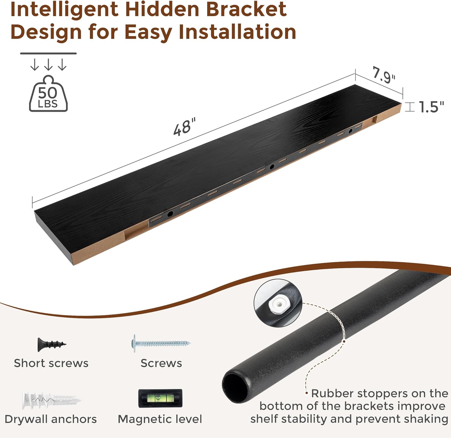 Heimlove 48 Inch Floating Shelves for Wall 8 Inch Deep Black Shelves Set of 2,Wall Mounted Rustic Wood Long Floating Shelf,Large Display & Storage Shelf with Invisible Brackets