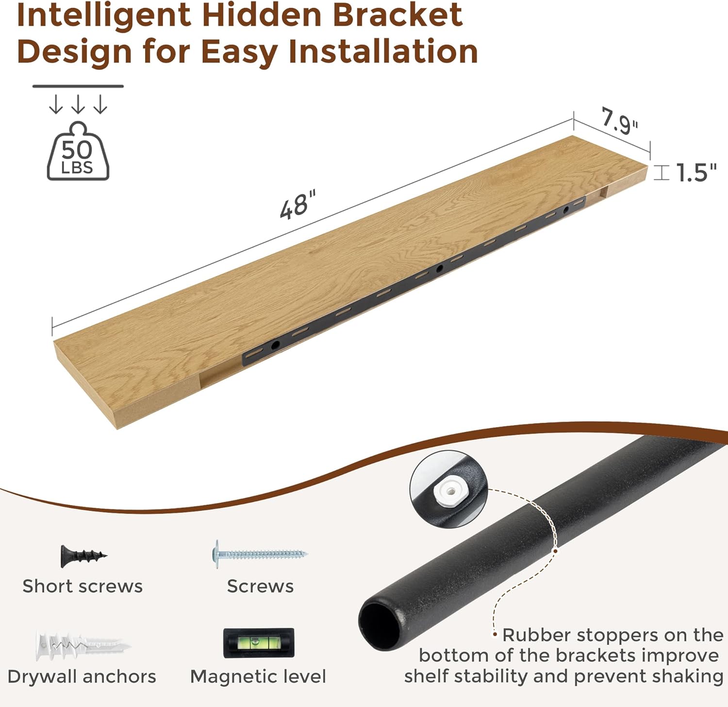 Heimlove 48 Inch Floating Shelves for Wall 8 Inch Deep Oak Shelves Set of 2,Wall Mounted Rustic Wood Long Floating Shelf,Large Display & Storage Shelf with Invisible Brackets