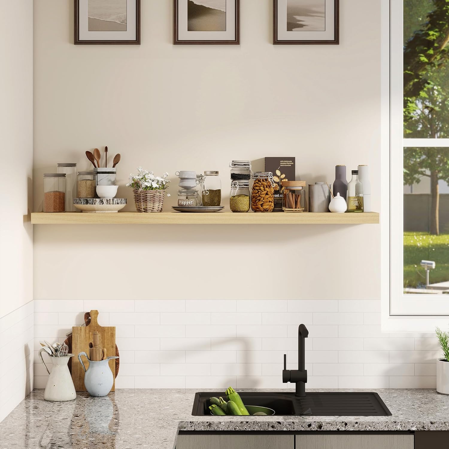 - 【DECORATIVE & FUNCTIONAL】The wall-mounted floating shelves are designed for decoration and storage, utilizing and decorating any space in your home. Used as shelf decor to show your collection, books, or prize, the hanging shelves are perfect for displaying your photo frame, small plants, model, or audio in your living room, office, study. And can also use as over the toilet storage shelf in the bathroom to hold toiletries or used as kitchen shelf to storage condiments.