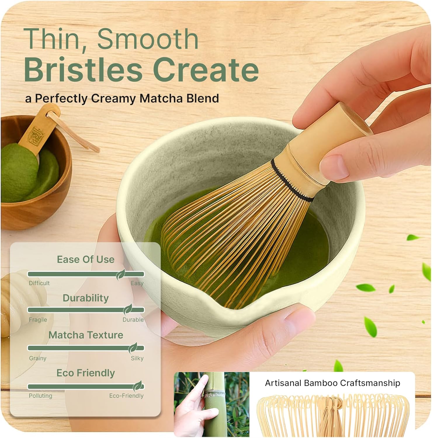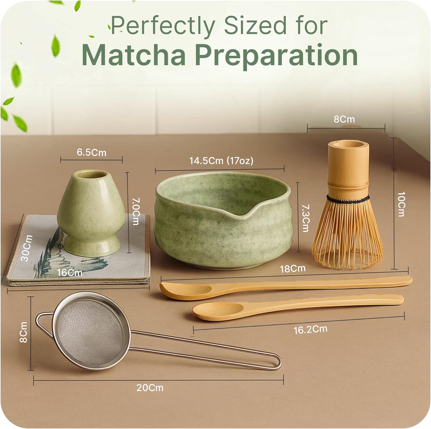- Premium Materials & Artisanal Quality It is made up with eco-friendly bamboo and lead-free ceramic, each item in this matcha tea set is carefully handcrafted and quality-inspected. From the 100-prong whisk to the durable stainless steel sifter and bowl, this set reflects the art of Japanese tea-making designed to last and elevate your experience
