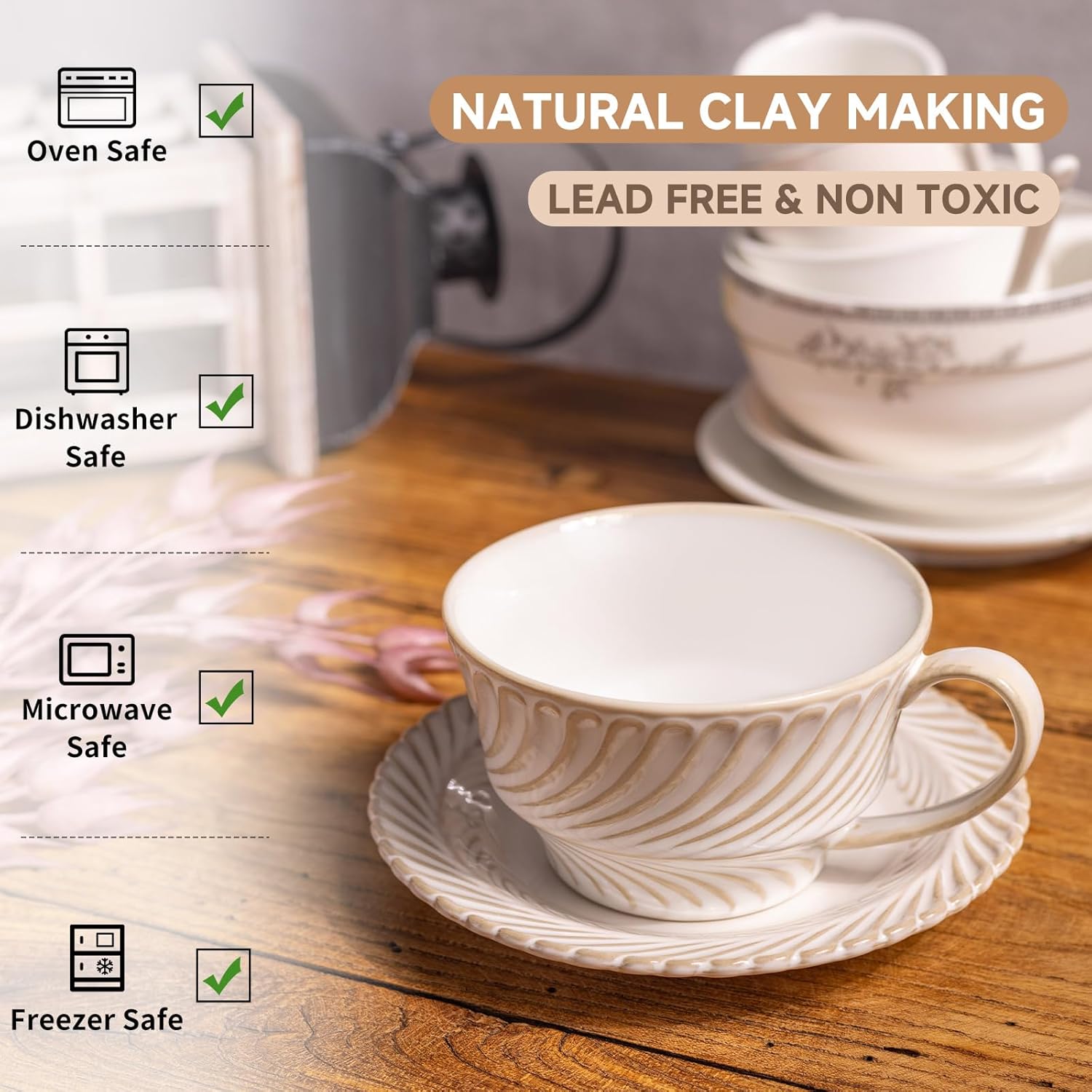 - Classic Cappuccino Cup with Farmhouse Charm: Serve up your morning brew in a timeless cappuccino cup that blends vintage charm with practical design. The wide opening and ergonomic handle enhance the pouring experience, making it easier to achieve consistent foam and latte art patterns. The matching saucer adds rustic beauty while preventing messes.
