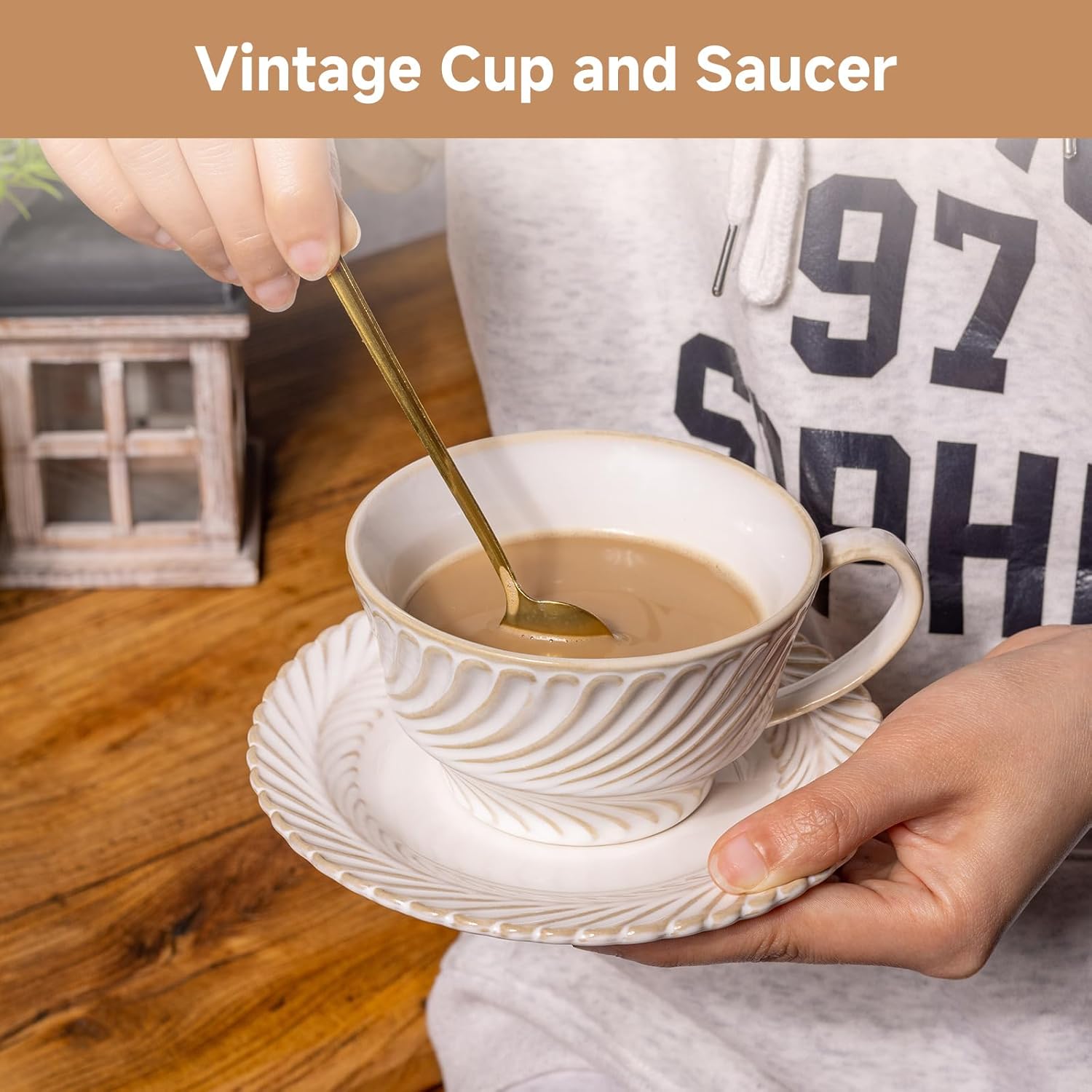 Ceramic Latte Cup with Saucer, 12 OZ Cappuccino Cup Vintage Cafe Art Cups for Espresso Turkish Coffee, Farmhouse Latte Mugs Tea Cups and Saucers Porcelain Set for Baristas Great Gift