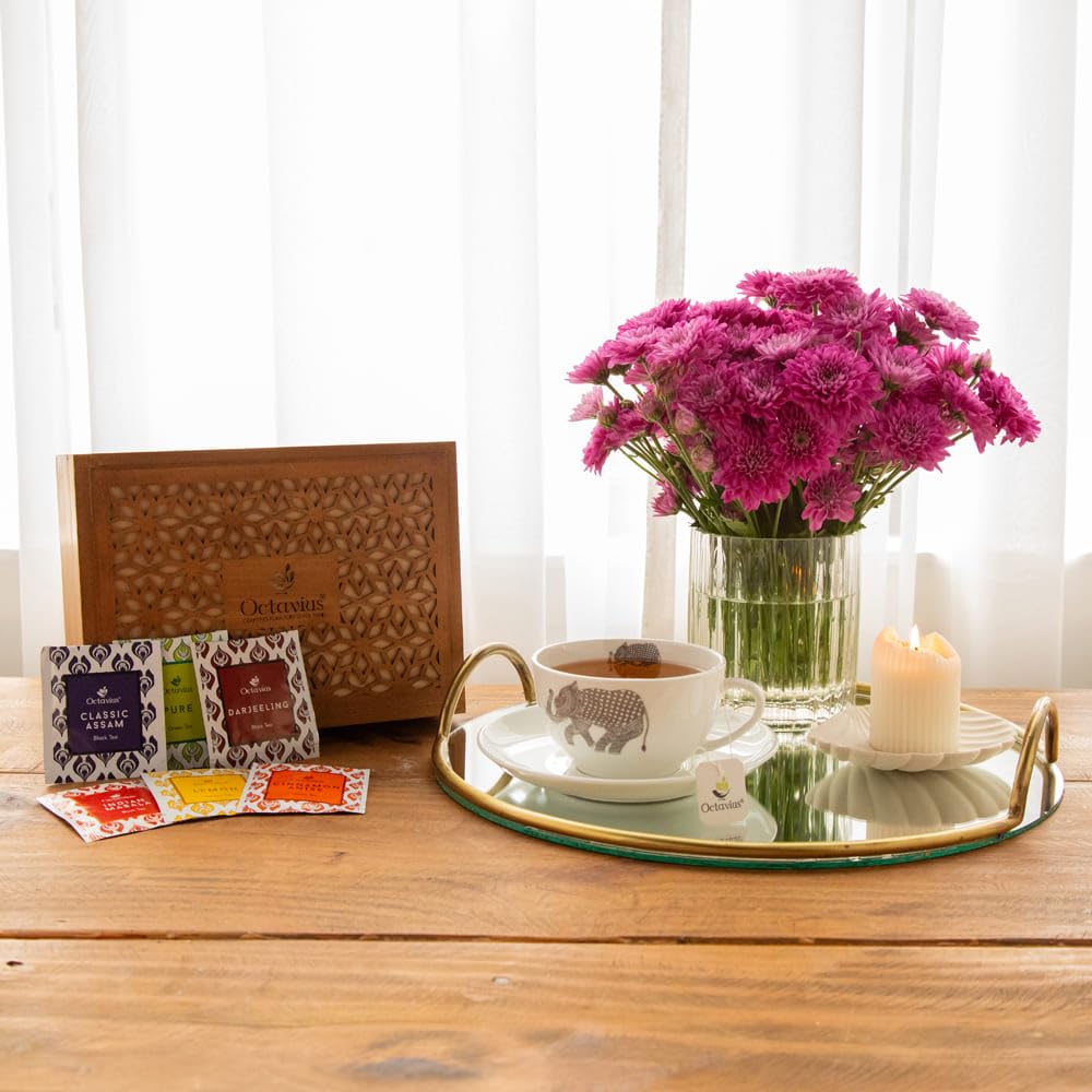 Octavius Floral Cutwork Wooden Tea Sampler Box | Tea Variety Pack Sampler | Green & Black Tea Assortment Gift Box | Perfect For Gifting & Personal Consumption - 6 flavor & 90 bags