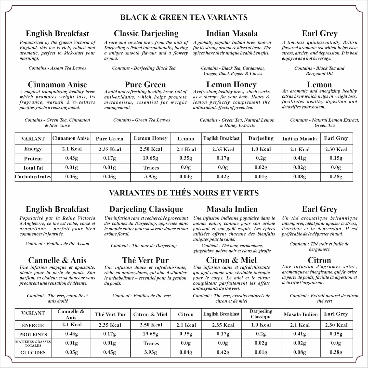 - Flavor : Pure Green tea , Cinnamon Anise Green Tea, Lemon Green tea, English Breakfast, Classic Darjeeling, Indian Masala ChaiPure Green tea , Cinnamon Anise Green Tea, Lemon Green tea, English Breakfast, Classic Darjeeling, Indian Masala Chai See more