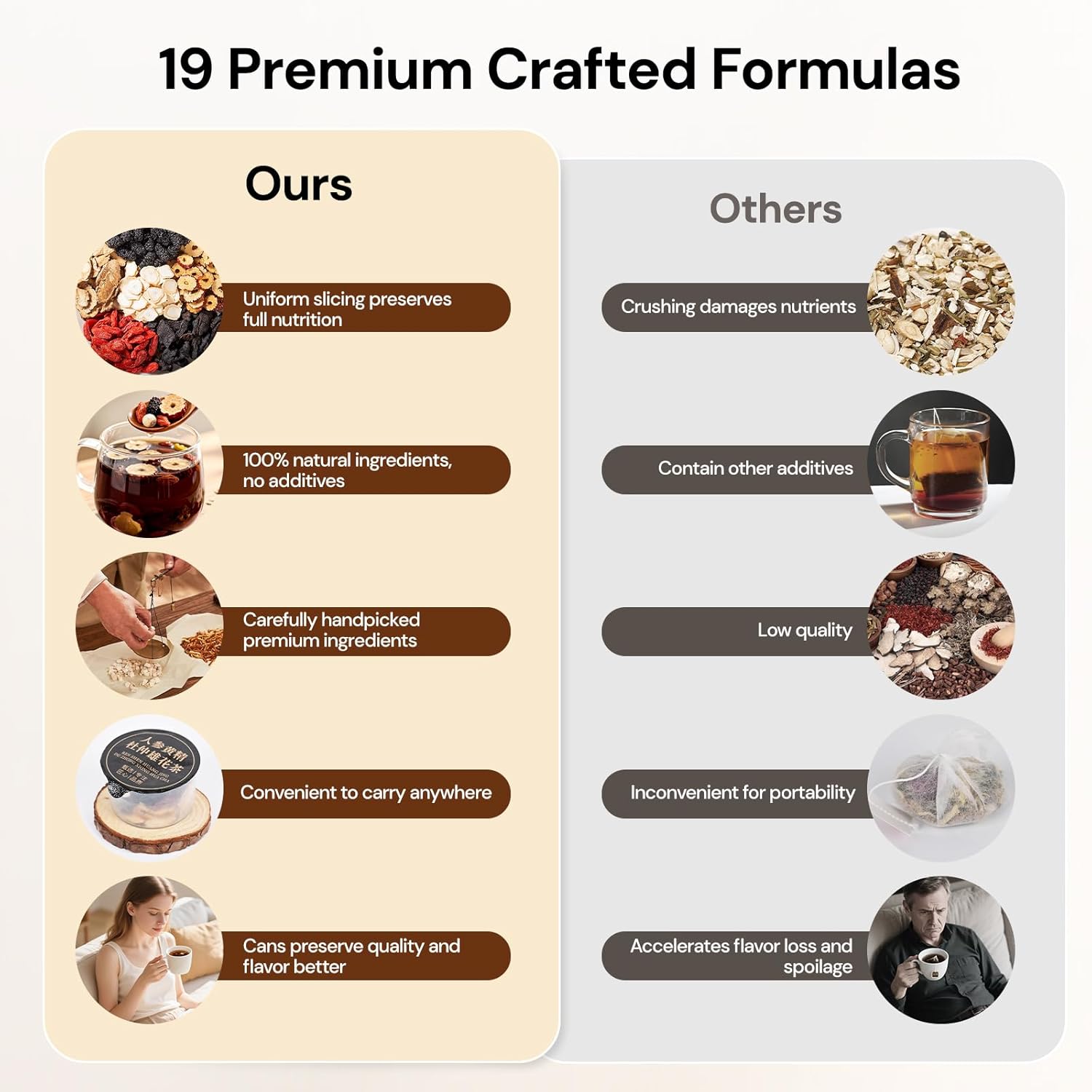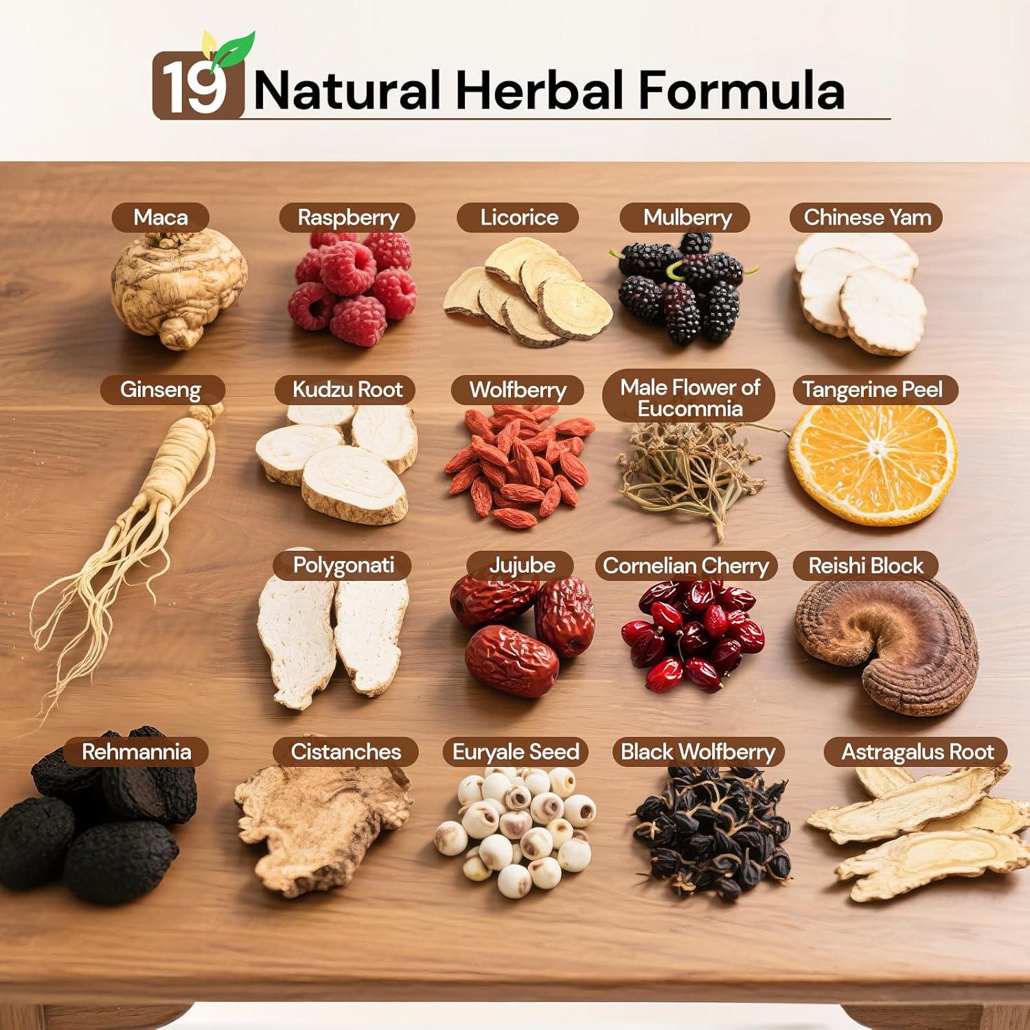 - 19 NATURAL INGREDIENTS: Formulated with a scientifically balanced blend of Maca,Raspberry,Licorice,Mulberry,Chinese Yam,Goji Berry,Jujube,Kudzu Root,Polygonatum,Dried Tangerine Peel,Eucommia Flower,Euryale Seed,,Cistanche,Rehmannia,Cornelian Cherry,Black Goji Berry,Reishi Block. Each herb is carefully selected for purity, then gently dried with a low-temperature process to preserve nutrients and flavor, ideal for you seeking natural health support