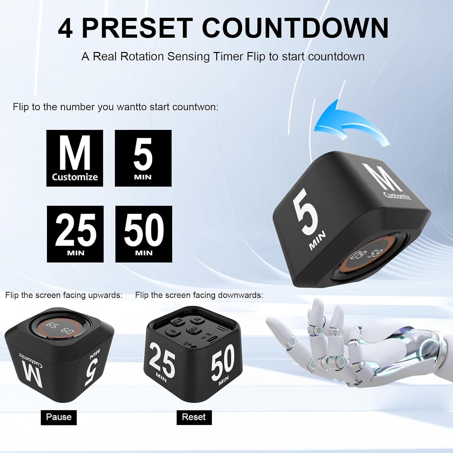 - 🎨 【4 Presets Countdown+ Customizable Memory Mode】 This cube desk productivity flip timer instantly set 5/10/25/50-min presets for workouts or cooking. Save personalized timers (up to 99Min 59Sec) on the M-side memory mode for daily routines