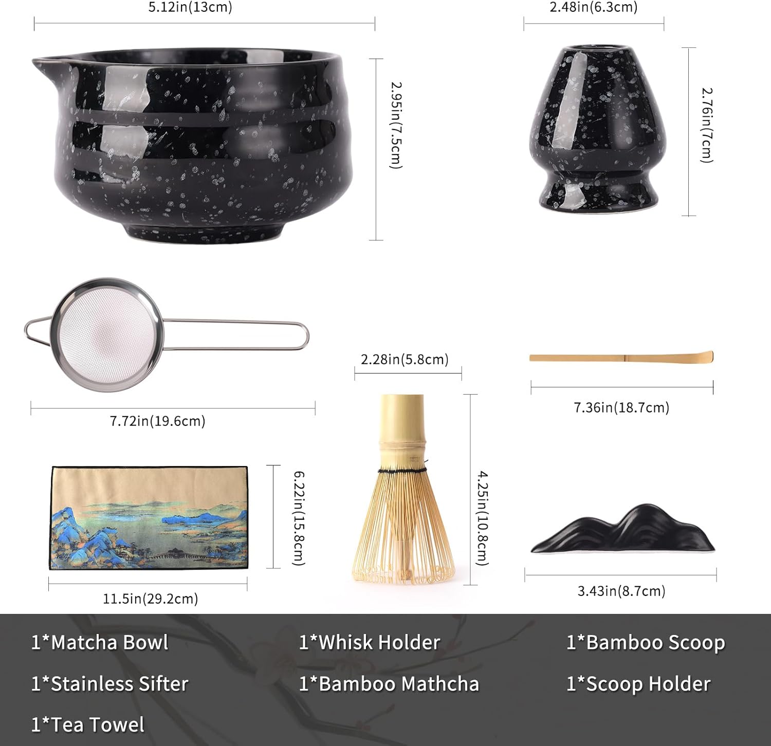 Japanese Matcha Whisk Set - 7-Piece Kit Bamboo Chasen, Ceramic Bowl with Spout, Stainless Steel Sifter & Holder Black