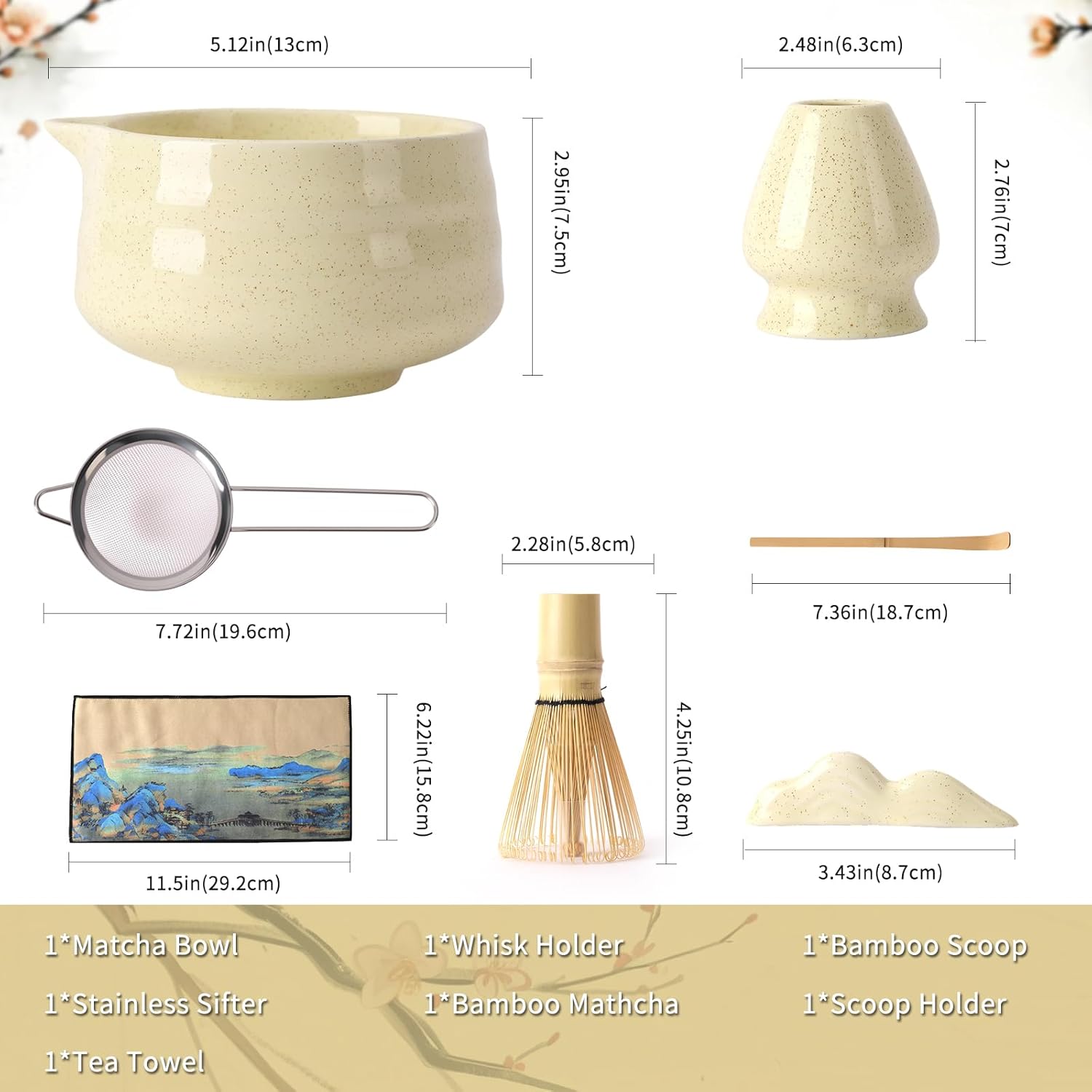 - Complete Kit: Includes: Ceramic matcha bowl with spout Handmade bamboo whisk + ceramic whisk holder Stainless steel sifter, bamboo scoop, ceramic scoop stand, absorbent cloth.