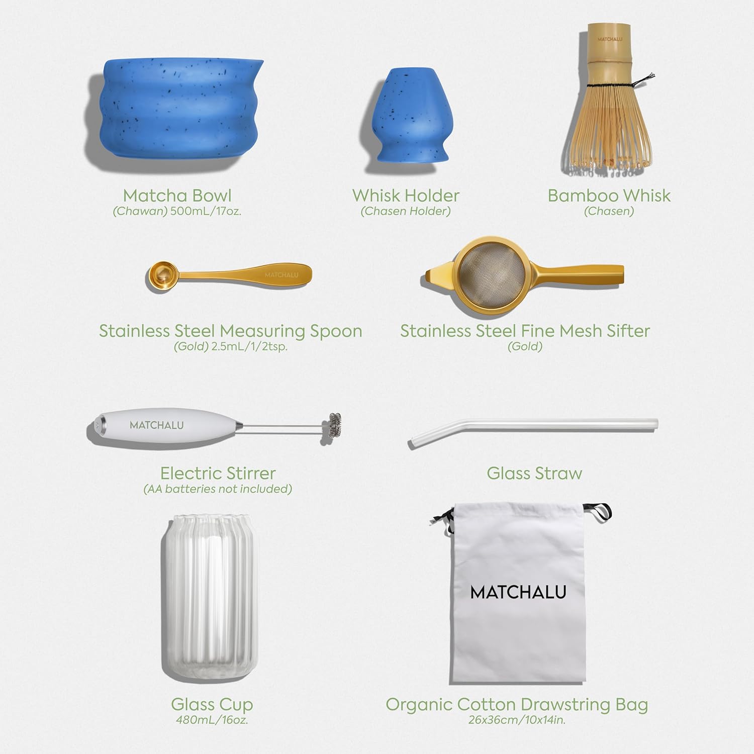 Premium 9 Piece Matcha Set Includes Ceramic Matcha Bowl, Bamboo Whisk & Holder, Stainless Steel Spoon & Sifter, Glass Cup & Straw, Electric Frother, Storage Bag - Gift for Matcha Lovers (Blue)