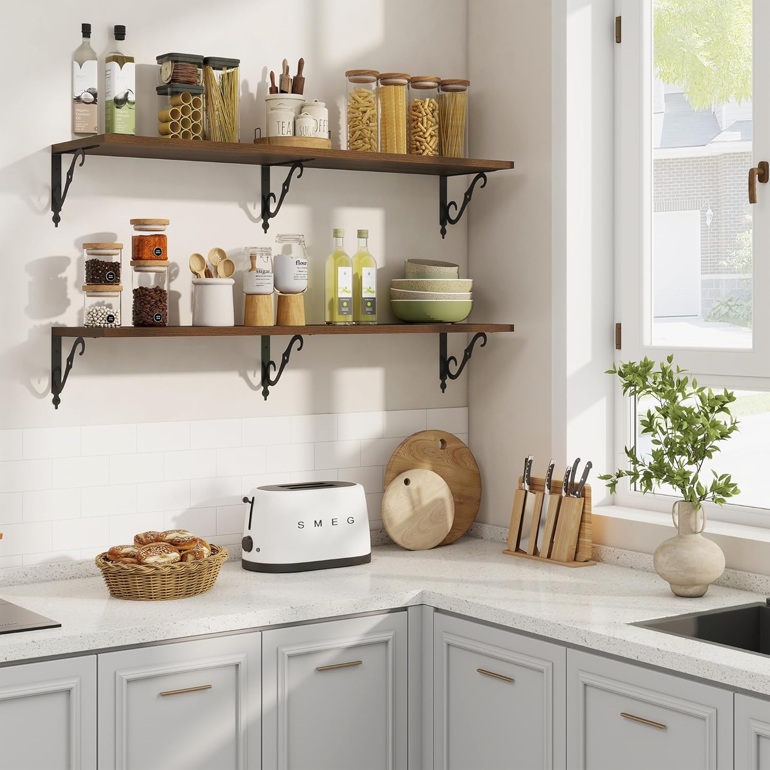 - 12 Inch Deep Floating Shelves: Our rustic deep floating shelves are made of high-quality particle board and sturdy brackets. The classic S-shaped brackets are designed to prevent sagging and ensure long-lasting stability. All edges are carefully sanded for a smooth finish