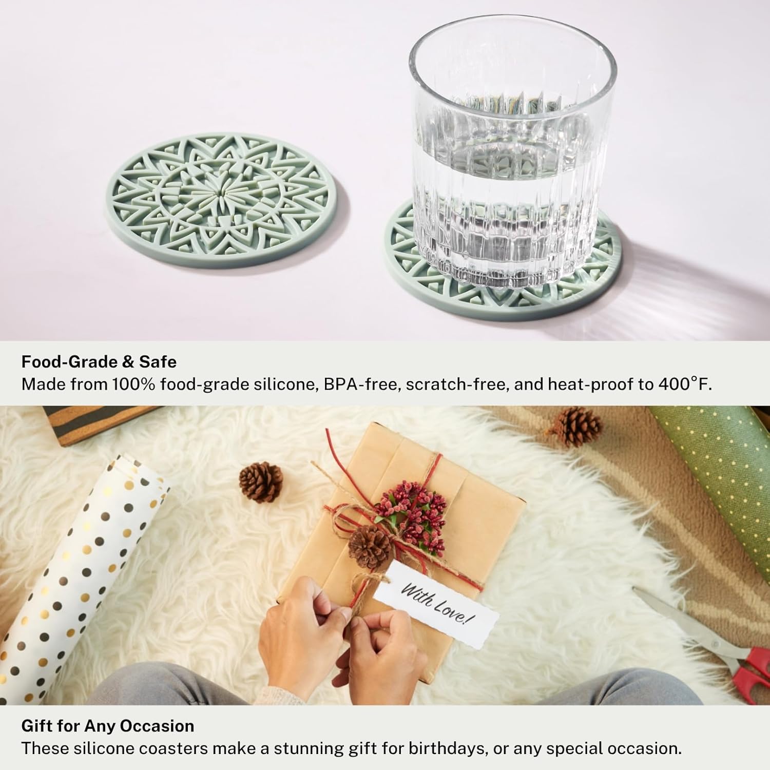 Set of 6 Sage Green Silicone Coasters with Holder, Drink Coasters with Tribal Pattern Shape- for Table Protection, Anti Slip, Nonstick, Heat Resistant, Deep Tray