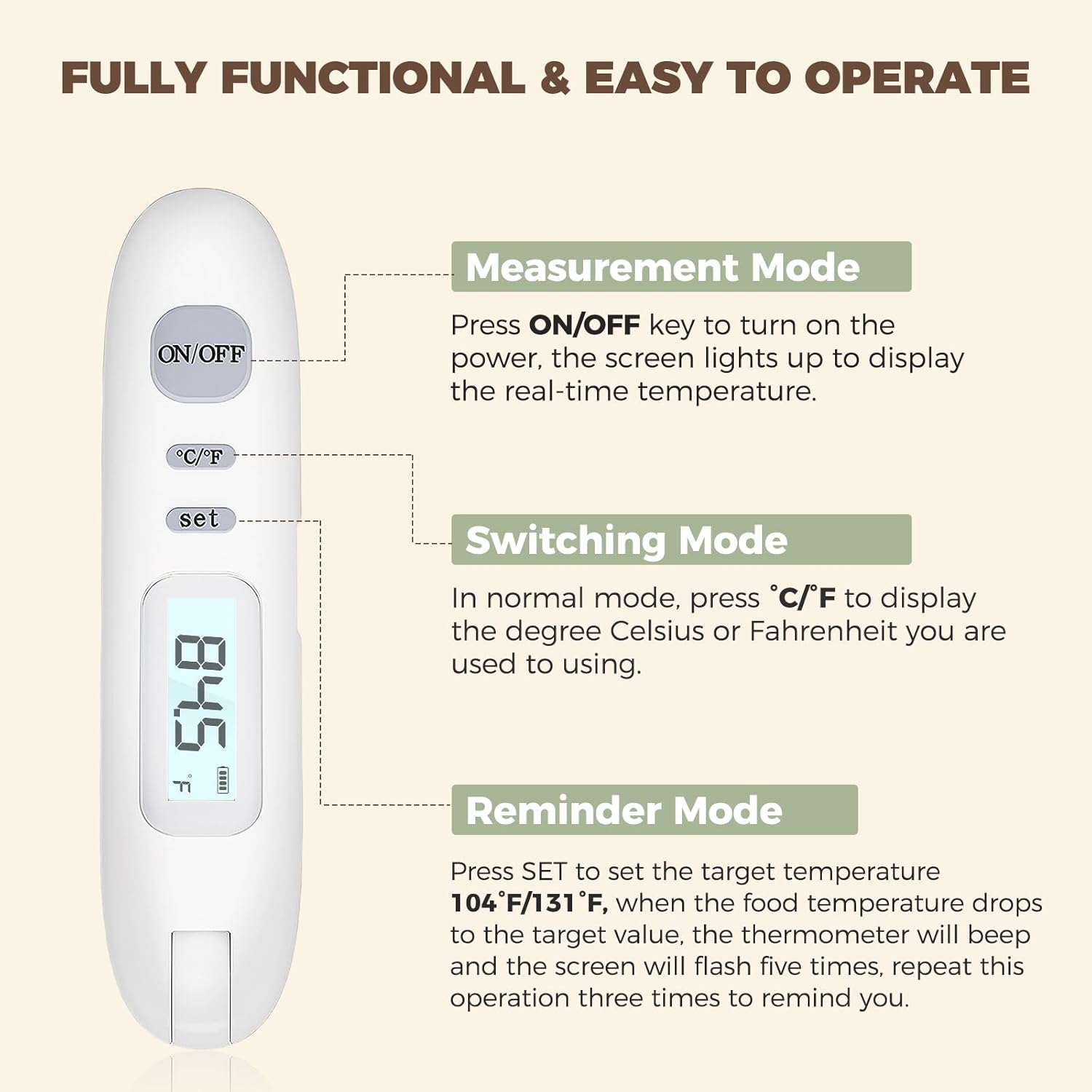 - Reminder Function | When the thermometer probe is inserted into food, you can set the target temperature to either 104°F (40°C) or 131.0°F (55°C). Once the food reaches the target temperature, the dispenser will beep and the backlit screen will flash five times to alert you.