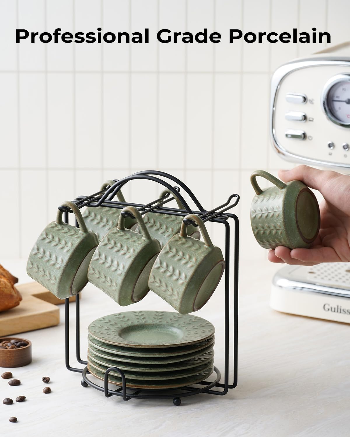 Espresso Cups Set of 6, 4 oz Demitasse Cups with Saucer and Metal Stand Small Coffee Cup Set, Porcelain Cappuccino Cups for Latte, Cafe Mocha and Tea, Green