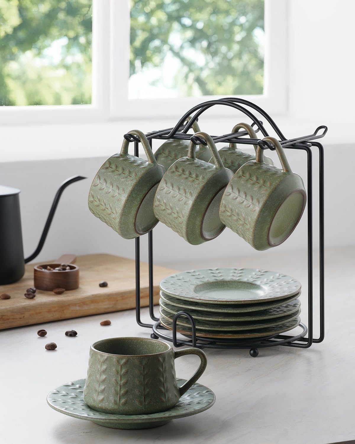 - Espresso Cup Set: This espresso cups set of 6 includes cups, saucers, and an iron rack, creating a tidy, stylish coffee station. It keeps your countertop organized with seamless storage and elegant presentation — ideal for any kitchen or espresso bar