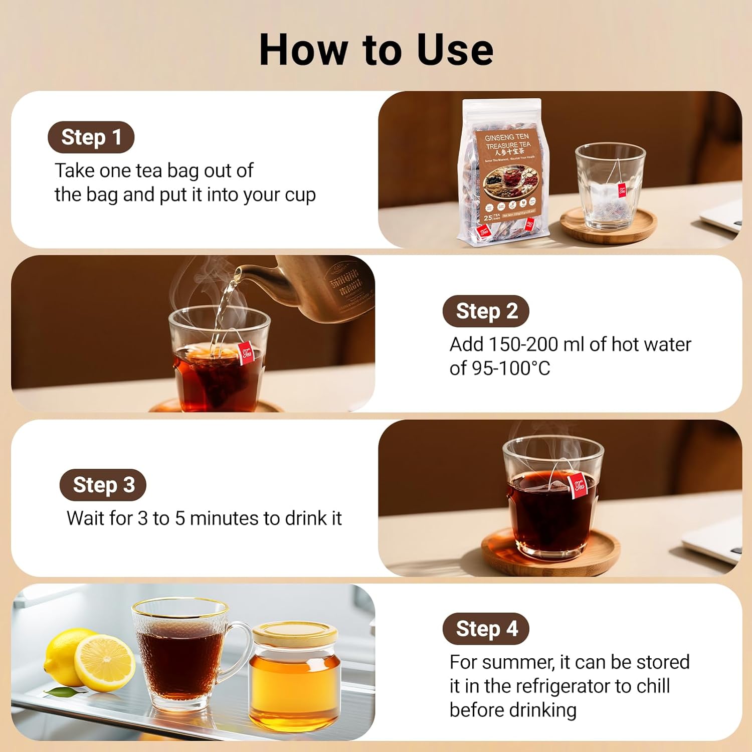 - SERVING AND STORAGE INSTRUCTION: Put one tea bag into your cup, add 150-200ml of hot water above 90°C, let it steep for 3 to 5 minutes, and it will be ready to drink. Our ginseng treasure tea can be brewed repeatedly 2 to 3 times. IN SUMMER, it can also be refrigerated for cold consumption and for opened but unbrewed tea bags, we recommend storing them in the refrigerator