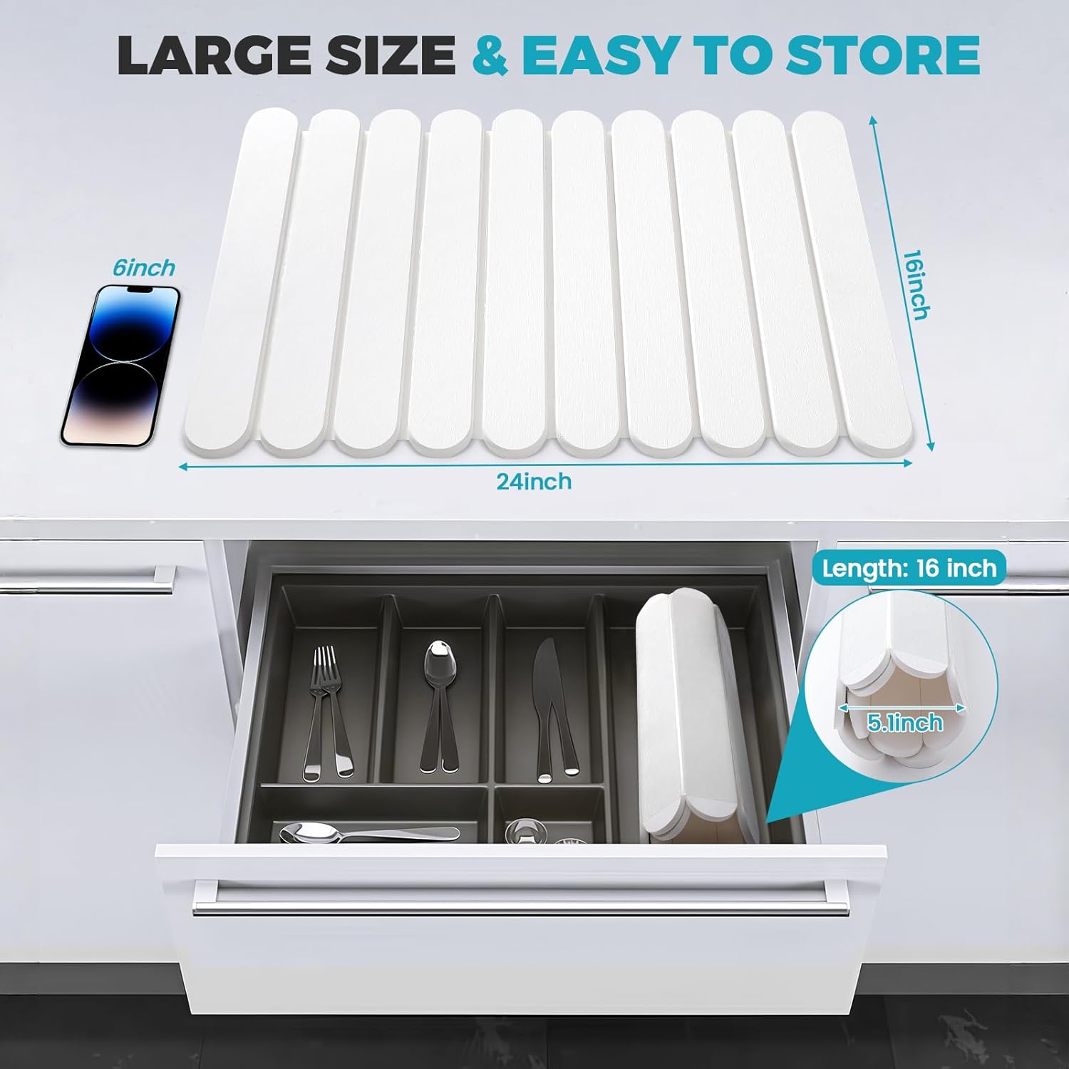 - Collapsible and Space-Saving: Measuring 24"(L)x16"(W) when unfolded, this collapsible stone drying mat offers ample space for your dishes. When not in use, easily store it in drawers or kitchen cabinets, maximizing your kitchen's organization