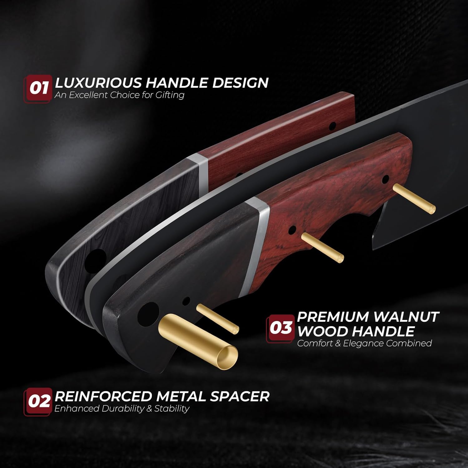 - Ergonomic Walnut Handle – Designed for Comfort & Control.Combining natural elegance with superior ergonomics, the hand-polished walnut wood handle features a sculpted finger groove for a secure, fatigue-free grip. Reinforced with a metal spacer and full-tang structure, it offers balance, durability, and long-term comfort. Whether you're slicing or chopping, this handle provides the control professionals demand with the style you’ll love.
