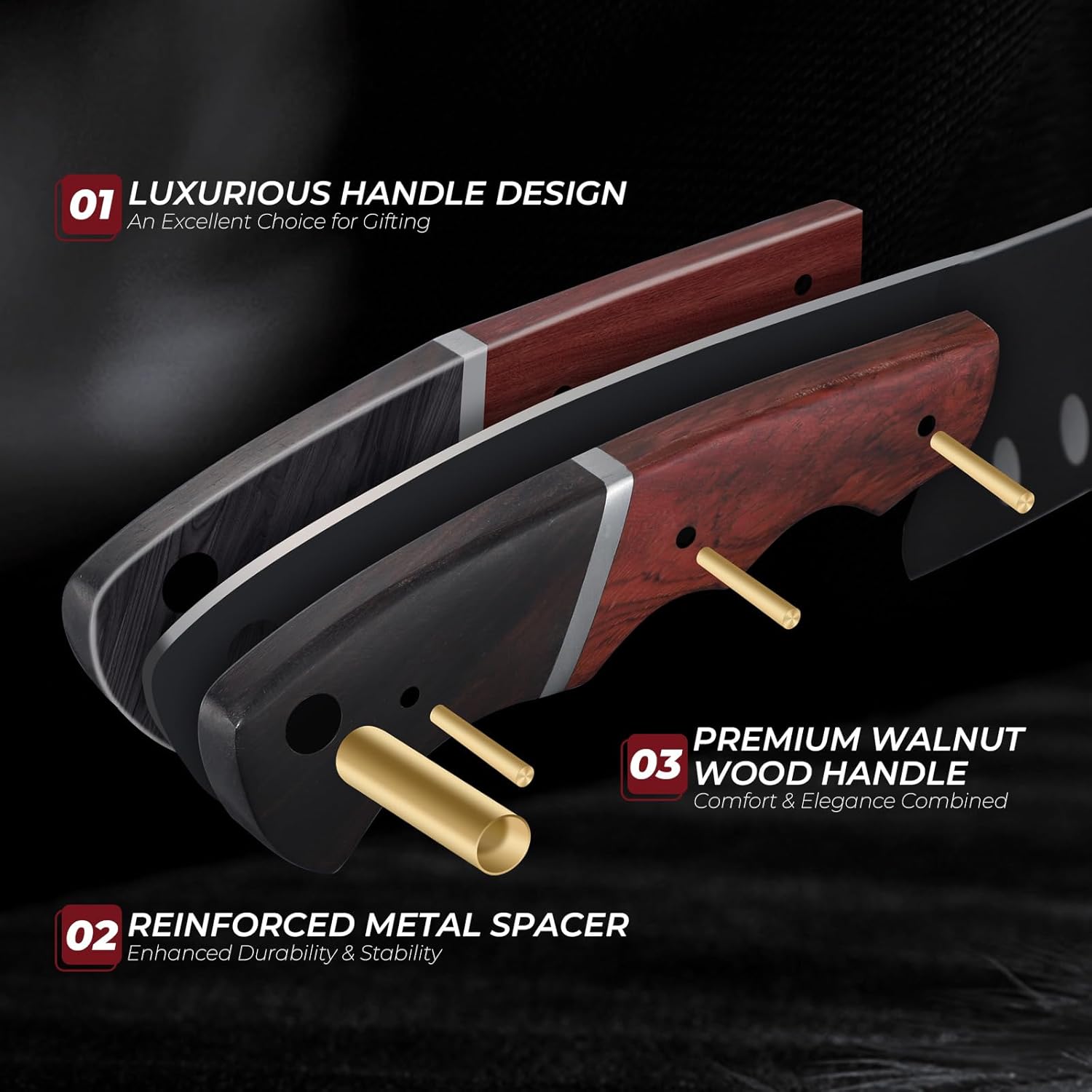 - Ergonomic Walnut Handle – Designed for Comfort & Control.Combining natural elegance with superior ergonomics, the hand-polished walnut wood handle features a sculpted finger groove for a secure, fatigue-free grip. Reinforced with a metal spacer and full-tang structure, it offers balance, durability, and long-term comfort. Whether you're slicing or chopping, this handle provides the control professionals demand with the style you’ll love.