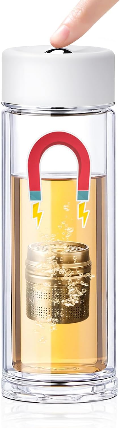 MagnaDrop Tea Tumbler – Double Wall Glass Tea Infuser Cup with Magnetic Steep Control & Bead Switch, Leakproof Travel Mug for Loose Leaf, 12.5oz