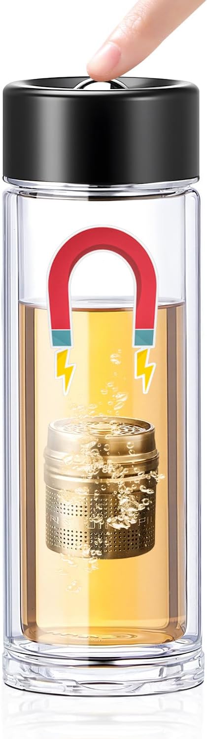 MagnaDrop Tea Tumbler – Double Wall Glass Tea Infuser Cup with Magnetic Steep Control & Bead Switch, Leakproof Travel Mug for Loose Leaf, 12.5oz