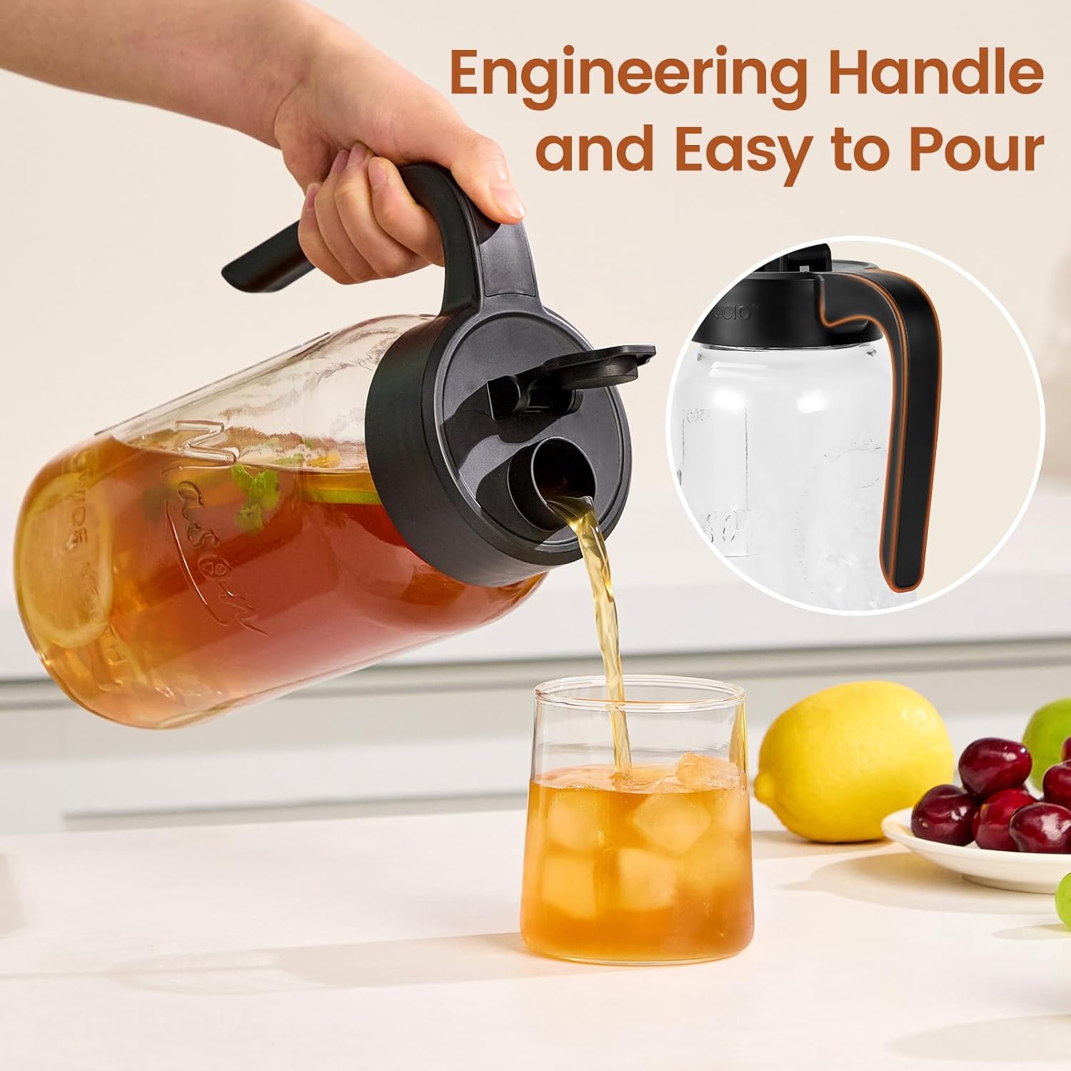 - Removable Filter: This iced tea pitcher comes with a detachable filter that can be easily installed on or removed from the lid of lemonade pitcher. This accessory effectively blocks fruits and ice in the ice tea pitcher from entering your cup when pouring.