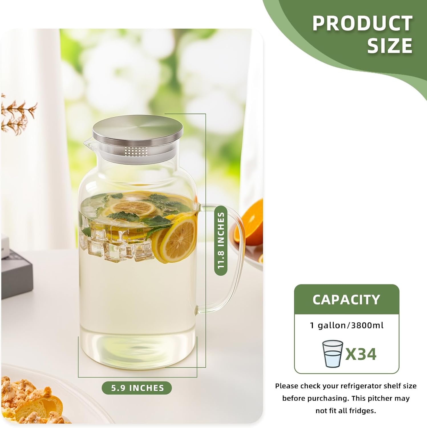 - [Spacious 3.8L Capacity]: With a generous 3.8L capacity, our pitcher is perfect for restaurants, parties or daily use. Its ample size reduces the need for frequent refills, saving you time and effort. It can hold water, milk, coffee, fresh juice, wine or any other beverage. [Note]: Please check your refrigerator shelf size before purchasing. This pitcher may not fit all fridges.