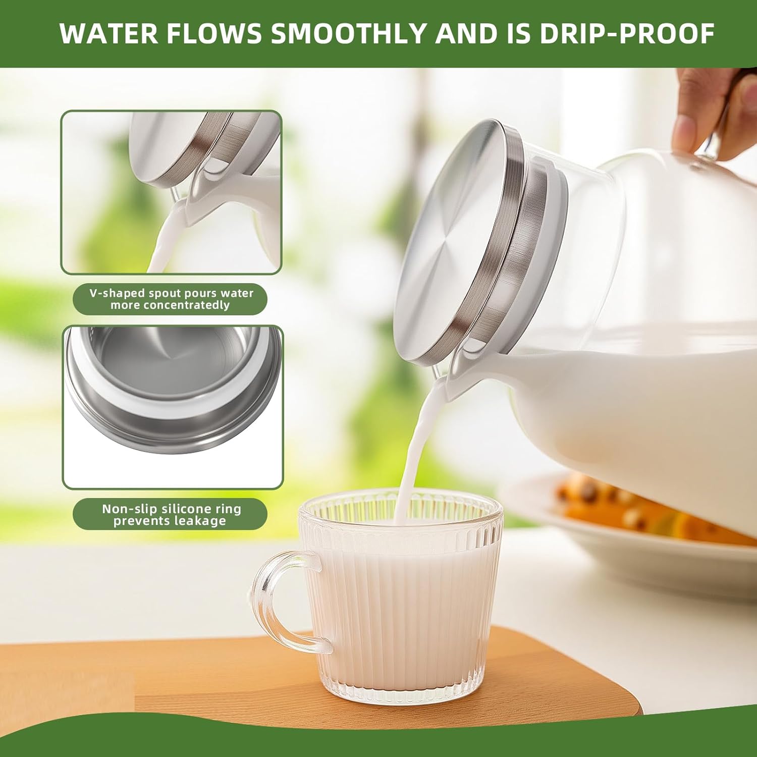 - [Anti-drip Spout & Reinforced Handle]: With its V-shaped spout, this pitcher is designed to minimize spills during pouring. The enhanced ergonomic handle, thicker and wider, ensures easier and more comfortable pouring.