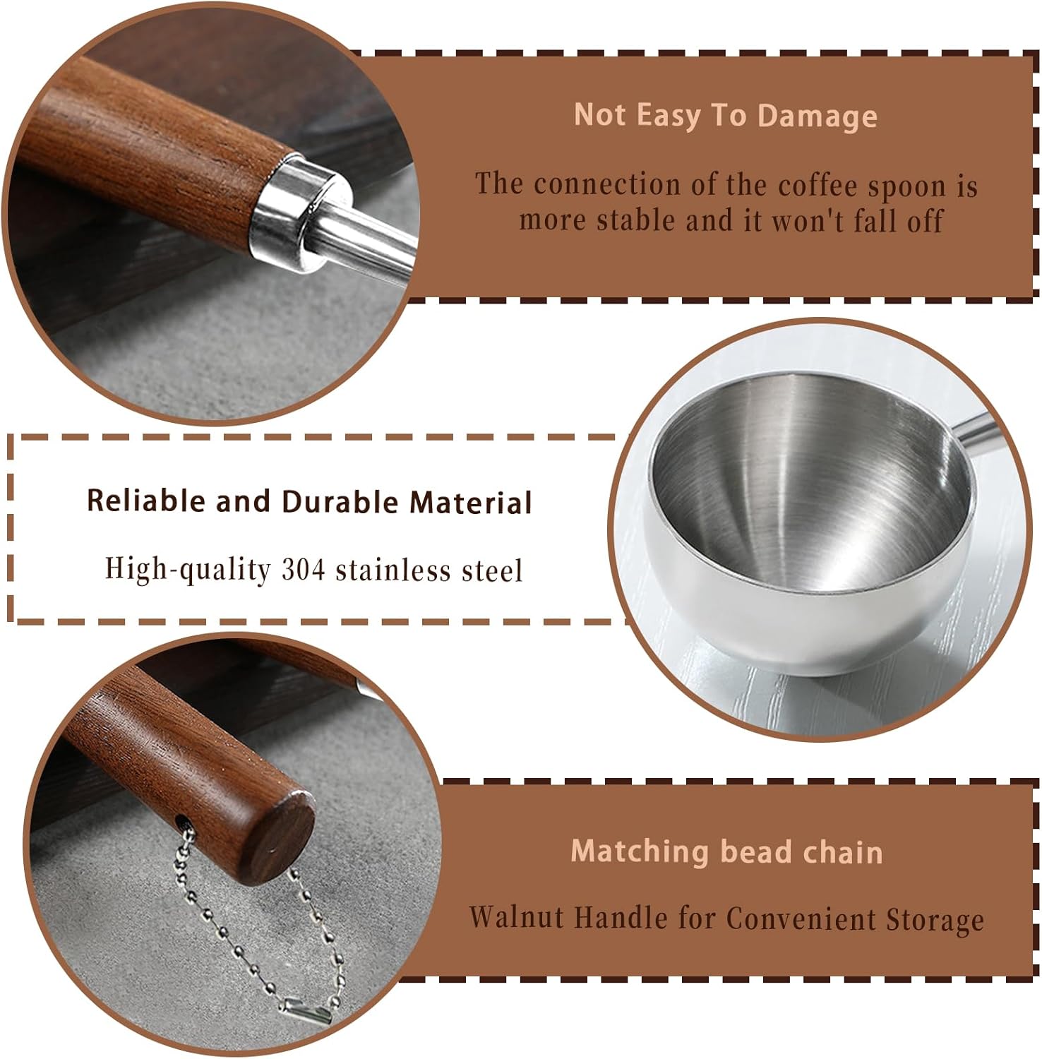 - 【Walnut Handle for Convenient Storage】: The coffee scoop spoon adopts ergonomic smooth walnut handle design, comfortable to hold. There is a hole on the wooden handle of the spoon, and the matching bead chain of the spoon can be hung anywhere you want.