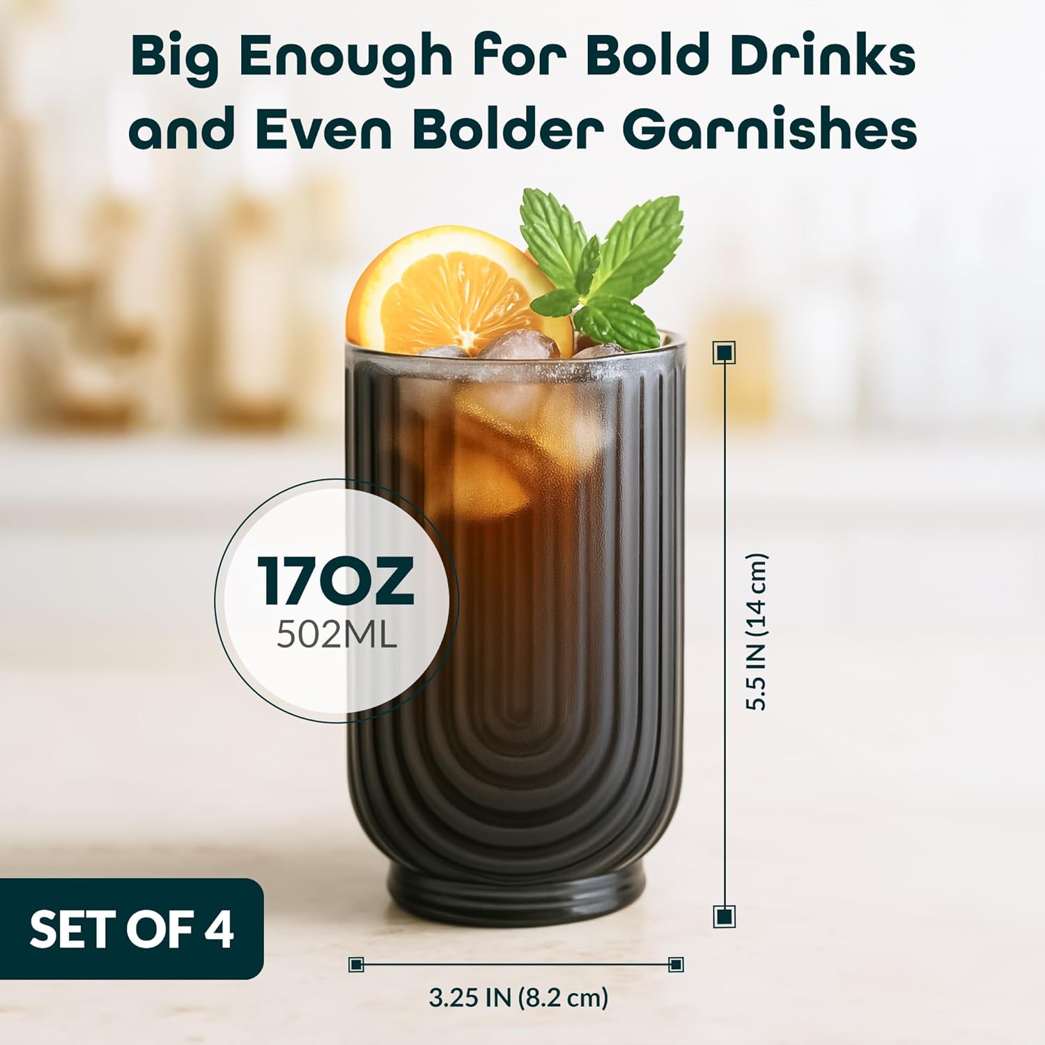 - 💪PREMIUM CONSTRUCTION: Each highball glass holds 17 ounces (502 ml). Our set of four Art Deco-colored glassware is made from high-quality, BPA- and lead-free glass with a modern smoky tint finish. To preserve its precious color, please HANDWASH our colored glassware with care.