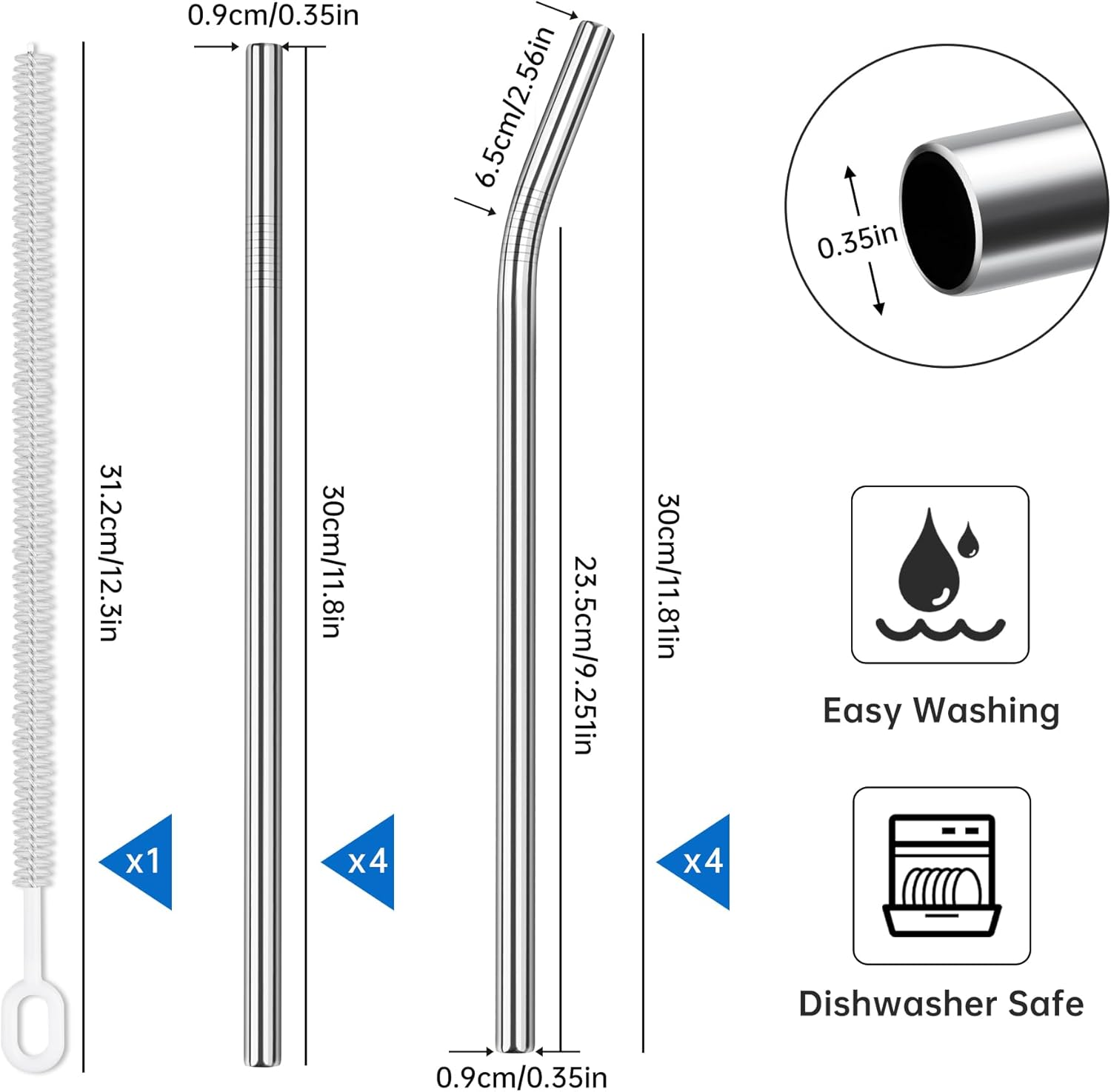 - Versatile 9-Piece Straw Set – Includes 4 straight straws, 4 bent straws (each 12" x 0.35"), and 1 heavy-duty full-bristle cleaning brush. A perfect all-in-one set to meet all your drinking needs.