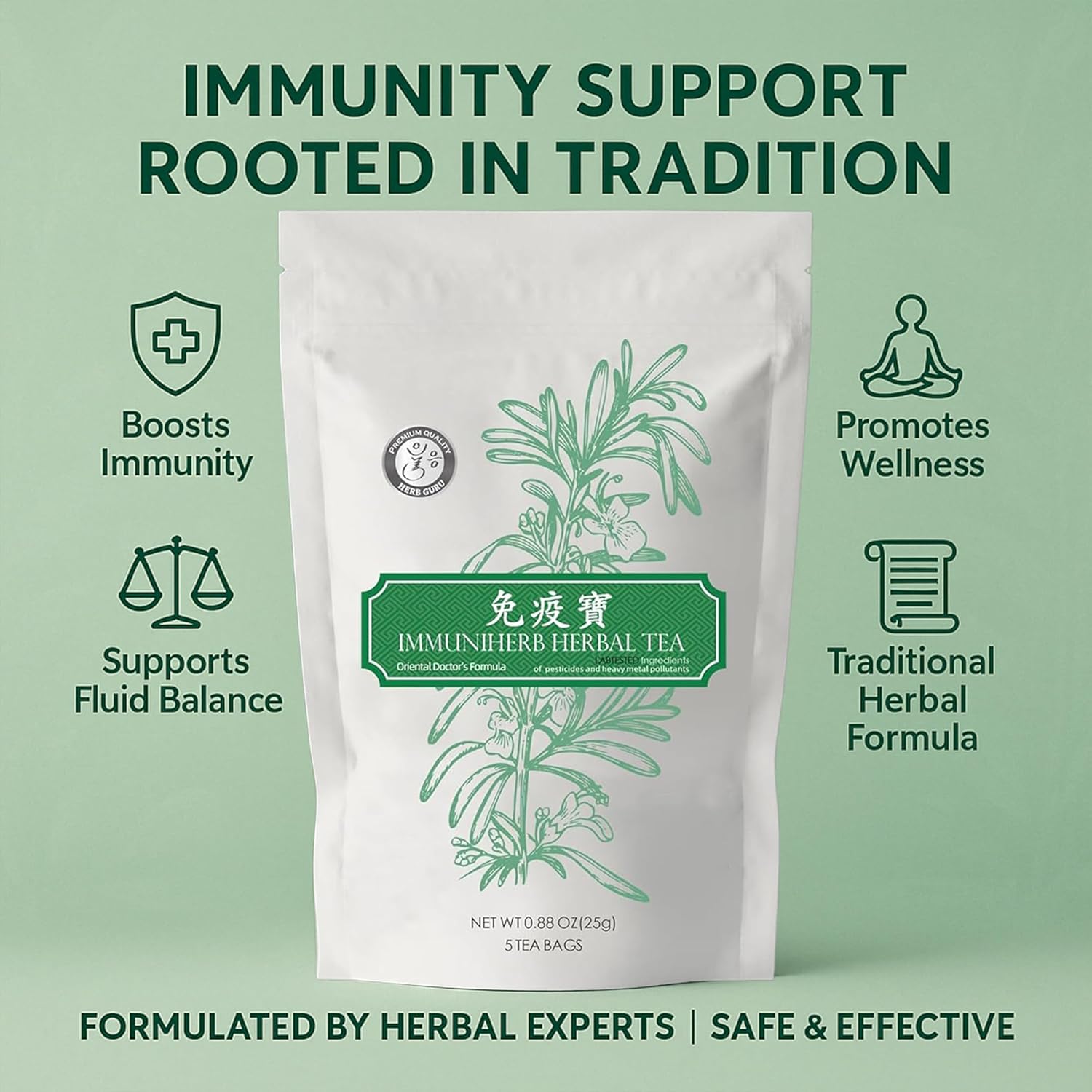 Herb Guru Immuniherb Herbal Tea Bags – Healthy Immune Function & Respiratory Comfort with Ginger, Balloon Flower, Mint & Licorice Root – Caffeine Free Tea, 0.88 Ounces